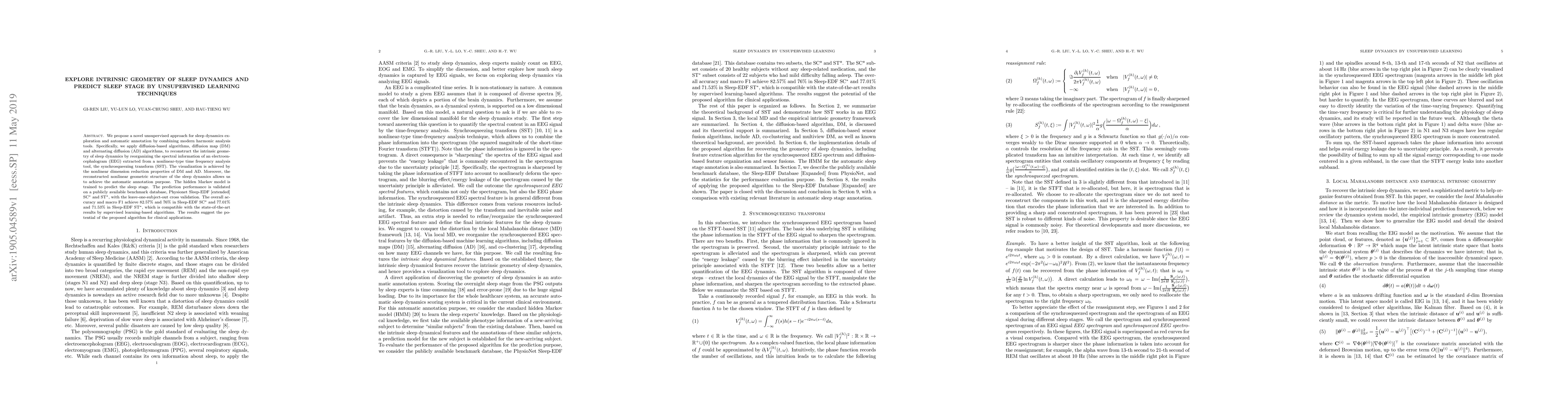 We propose a novel unsupervised approach for sleep dynamics exploration and automatic annotation by combining modern harmonic analysis tools. Specifically, we apply diffusion-based algorithms, diffusion map (DM) and alternating diffusion (AD) algorithms, to reconstruct the intrinsic geometry of sleep dynamics by reorganizing the spectral information of an electroencephalogram (EEG) extracted from a nonlinear-type time frequency analysis tool, the synchrosqueezing transform (SST). The visualization is achieved by the nonlinear dimension reduction properties of DM and AD. Moreover, the reconstructed nonlinear geometric structure of the sleep dynamics allows us to achieve the automatic annotation purpose. The hidden Markov model is trained to predict the sleep stage. The prediction performance is validated on a publicly available benchmark database, Physionet Sleep-EDF [extended] SC* and ST*, with the leave-one-subject-out cross validation. The overall accuracy and macro F1 achieve 82:57% and 76% in Sleep-EDF SC* and 77.01% and 71:53% in Sleep-EDF ST*, which is compatible with the state-of-the-art results by supervised learning-based algorithms. The results suggest the potential of the proposed algorithm for clinical applications.