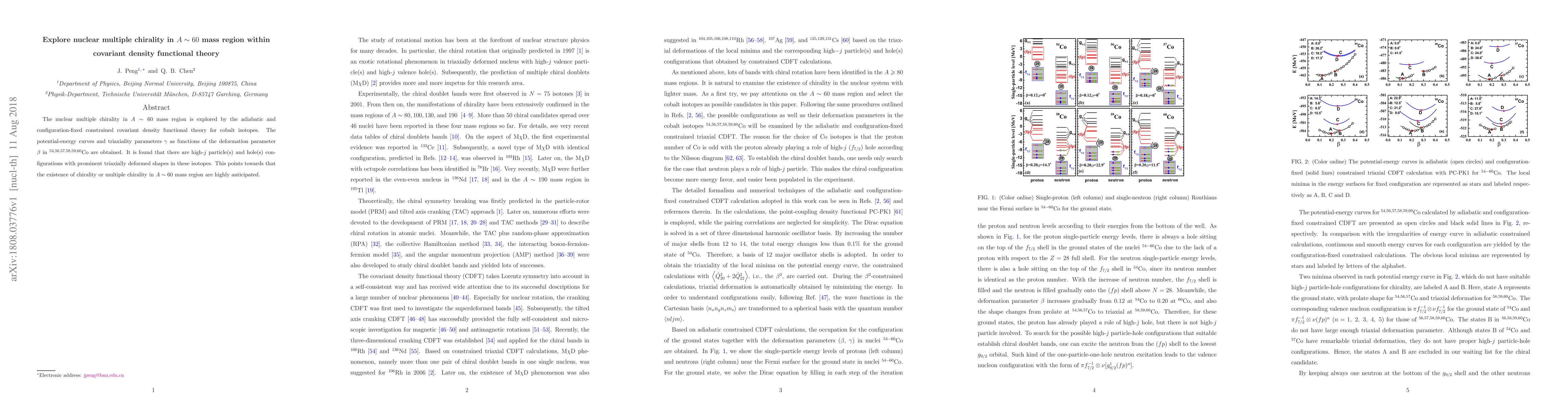 This study investigates nuclear multiple chirality in $A\sim60$ isotopes using covariant density functional theory, revealing high-$j$ configurations and triaxial deformations in cobalt isotopes. The findings suggest the anticipated presence of chirality in this mass region.