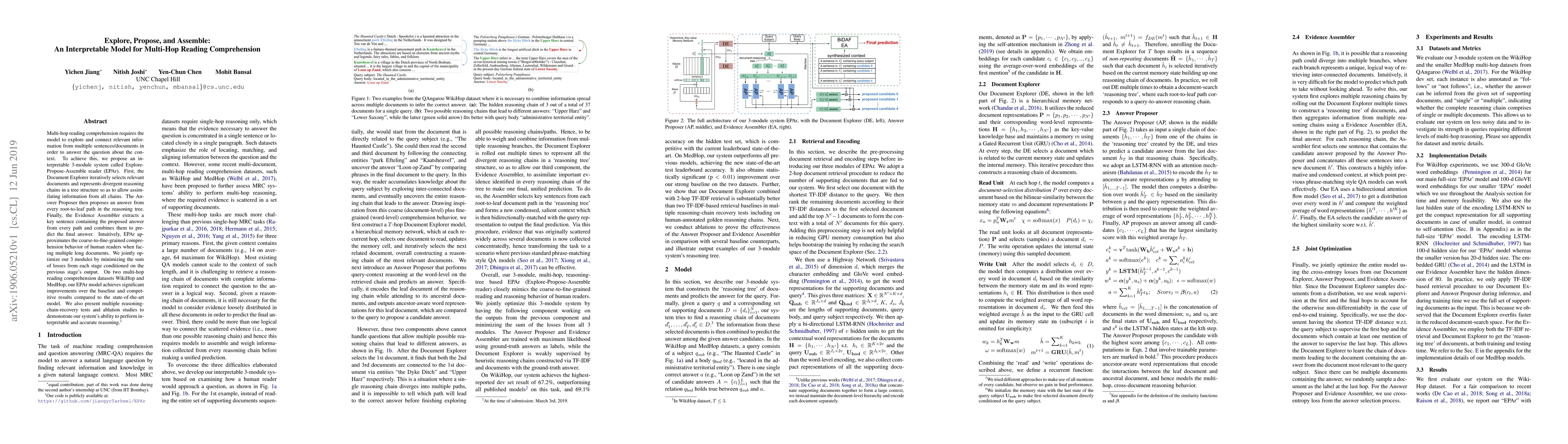 The paper proposes an interpretable 3-module system called EPAr for multi-hop reading comprehension, which iteratively explores relevant documents, proposes answers from reasoning chains, and assembles evidence to predict the final answer. The model achieves significant improvements over baselines and demonstrates interpretable and accurate reasoning through ablation studies and reasoning-chain-recovery tests.