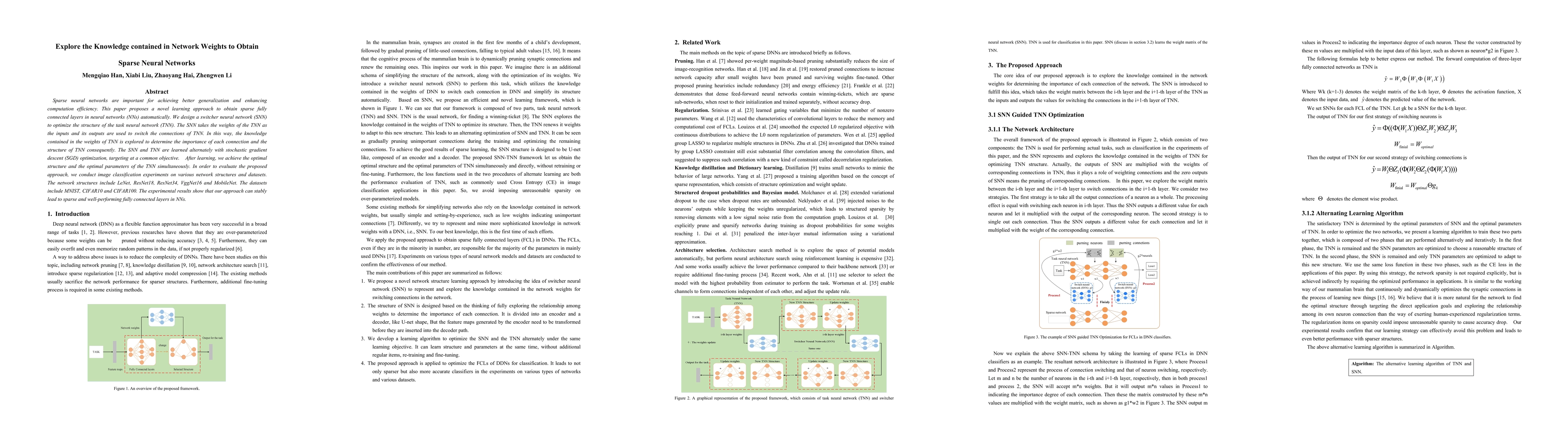 This paper proposes a method to automatically obtain sparse fully connected layers in neural networks using a switcher neural network (SNN) that optimizes the task neural network (TNN) by exploring the knowledge in TNN's weights. Experiments on various network structures and datasets demonstrate stable generation of sparse and effective neural networks.