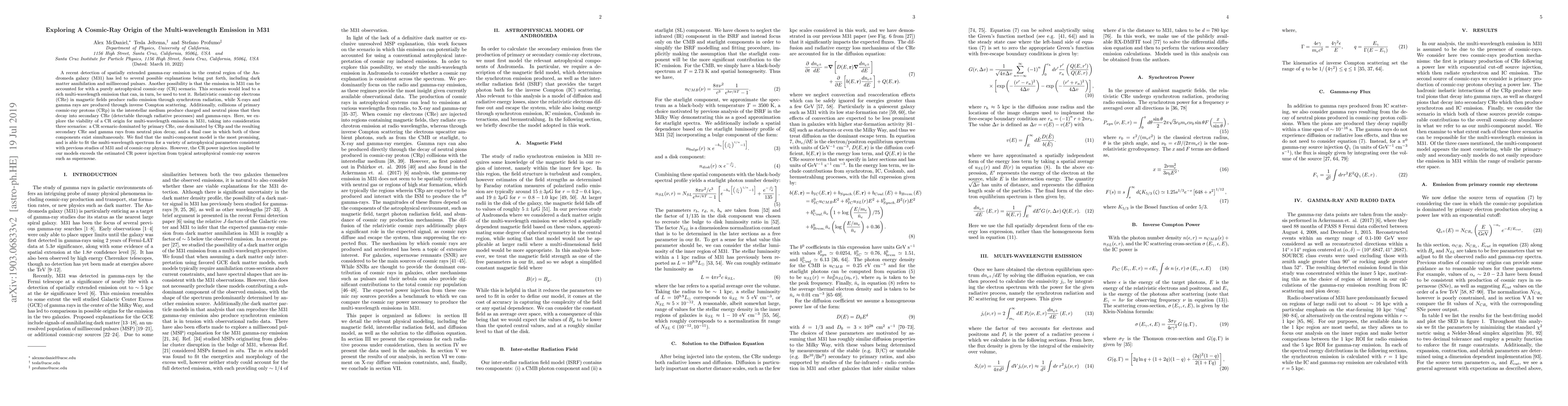 This research explores the possibility of cosmic rays being the source of multi-wavelength emission in the Andromeda galaxy (M31). The study considers three scenarios: one dominated by primary cosmic-ray electrons, another by cosmic-ray protons leading to secondary particles, and a combined scenario. The multi-component model best fits the observed spectrum, but the required cosmic-ray power exceeds what's typically produced by sources like supernovae.