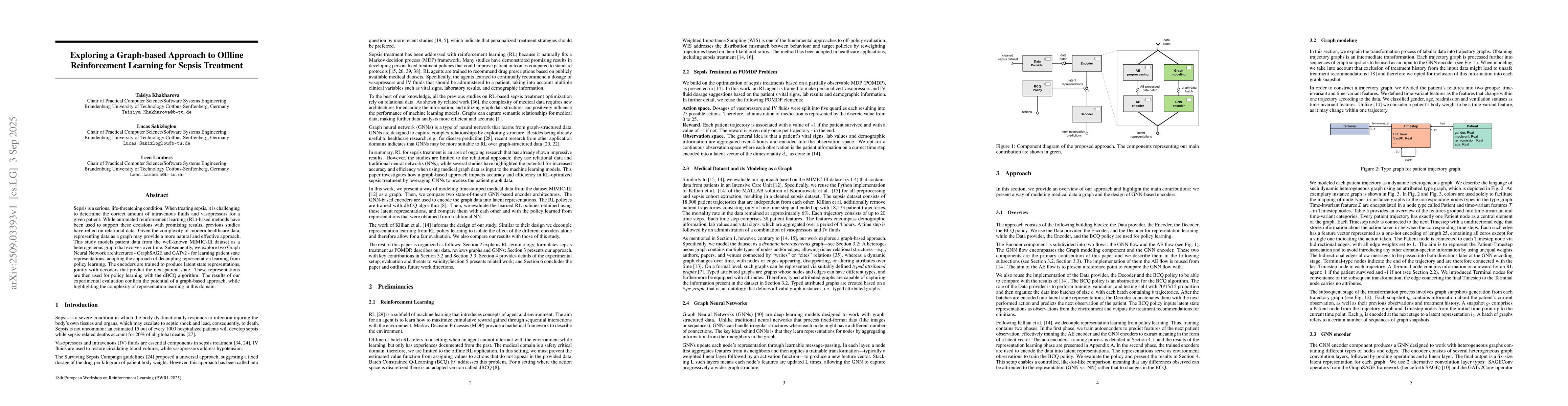 Sepsis is a serious, life-threatening condition. When treating sepsis, it is challenging to determine the correct amount of intravenous fluids and vasopressors for a given patient. While automated reinforcement learning (RL)-based methods have been used to support these decisions with promising results, previous studies have relied on relational data. Given the complexity of modern healthcare data, representing data as a graph may provide a more natural and effective approach. This study models patient data from the well-known MIMIC-III dataset as a heterogeneous graph that evolves over time. Subsequently, we explore two Graph Neural Network architectures - GraphSAGE and GATv2 - for learning patient state representations, adopting the approach of decoupling representation learning from policy learning. The encoders are trained to produce latent state representations, jointly with decoders that predict the next patient state. These representations are then used for policy learning with the dBCQ algorithm. The results of our experimental evaluation confirm the potential of a graph-based approach, while highlighting the complexity of representation learning in this domain.