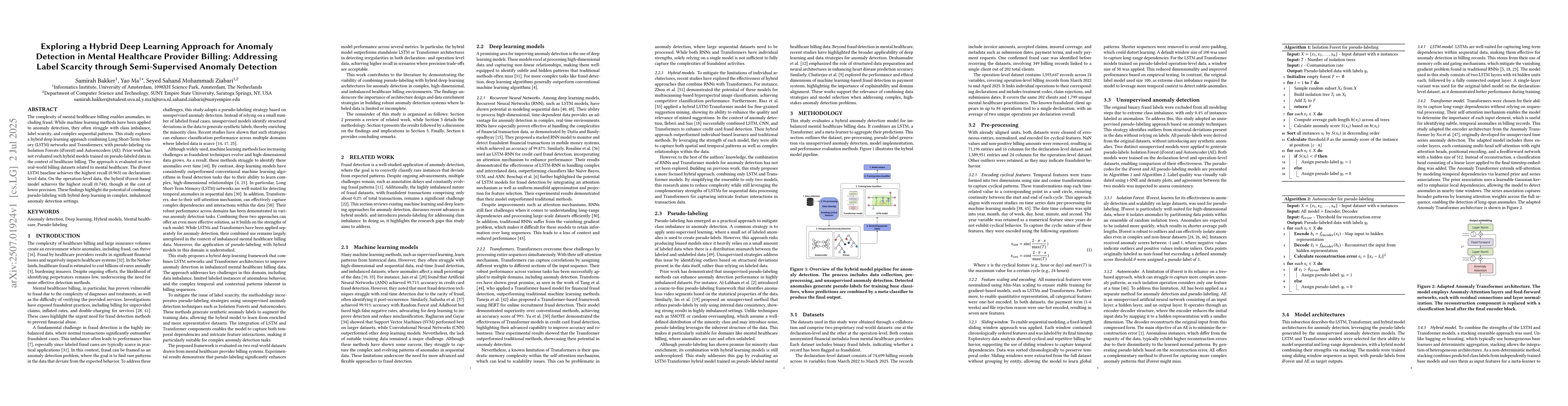 The complexity of mental healthcare billing enables anomalies, including fraud. While machine learning methods have been applied to anomaly detection, they often struggle with class imbalance, label scarcity, and complex sequential patterns. This study explores a hybrid deep learning approach combining Long Short-Term Memory (LSTM) networks and Transformers, with pseudo-labeling via Isolation Forests (iForest) and Autoencoders (AE). Prior work has not evaluated such hybrid models trained on pseudo-labeled data in the context of healthcare billing. The approach is evaluated on two real-world billing datasets related to mental healthcare. The iForest LSTM baseline achieves the highest recall (0.963) on declaration-level data. On the operation-level data, the hybrid iForest-based model achieves the highest recall (0.744), though at the cost of lower precision. These findings highlight the potential of combining pseudo-labeling with hybrid deep learning in complex, imbalanced anomaly detection settings.