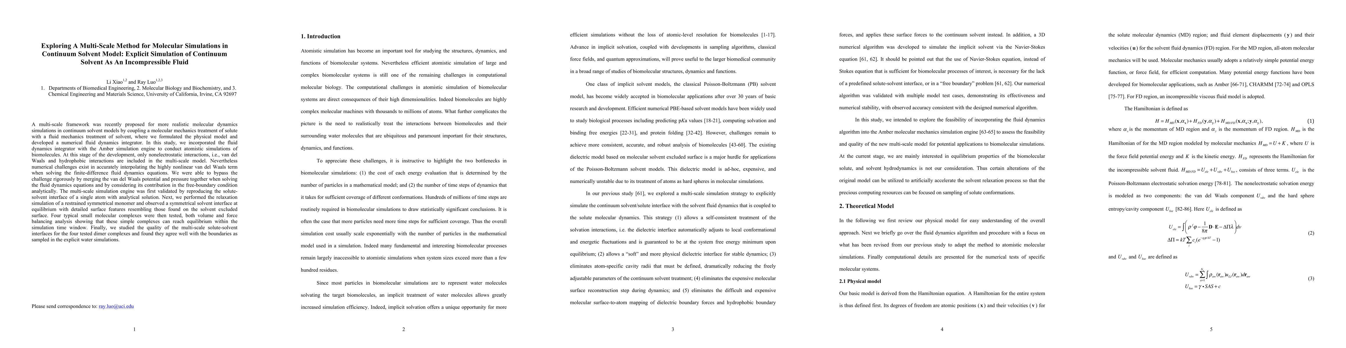 This paper proposes a multi-scale method for molecular simulations in continuum solvent models, coupling molecular mechanics with fluid dynamics. The method was integrated into the Amber simulation engine to simulate biomolecules, focusing on nonelectrostatic interactions. Challenges in accurately interpolating van del Waals forces were addressed by merging the potential with pressure in fluid dynamics equations. The method was validated through simulations showing accurate solute-solvent interfaces and equilibrium in small molecular complexes.