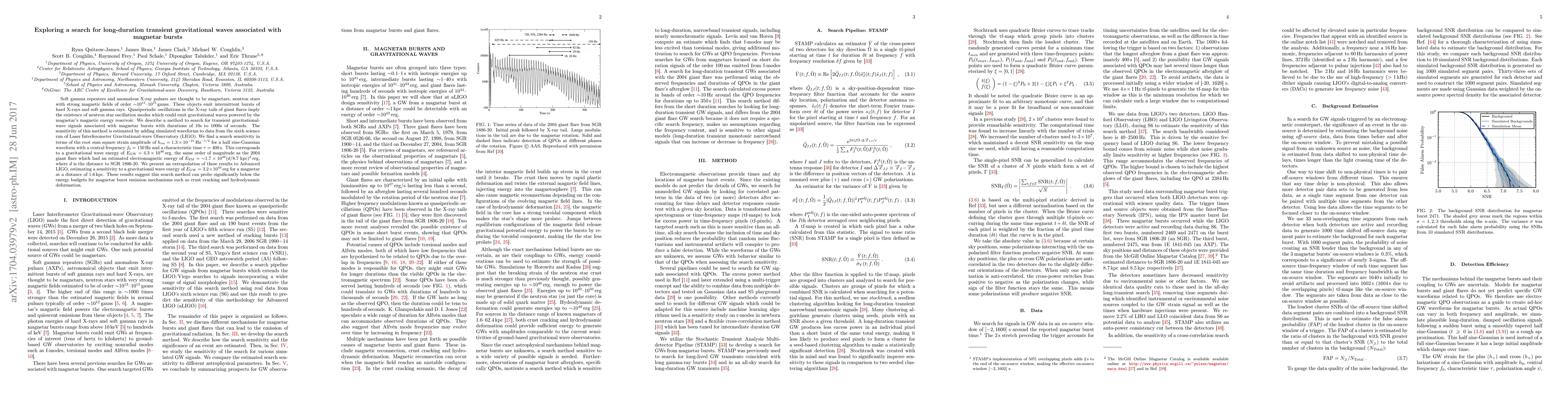 This paper outlines a method to detect long-duration transient gravitational waves linked to magnetar bursts, estimating LIGO's sensitivity to such signals. The proposed search technique achieves a gravitational wave strain sensitivity of $h_{\mathrm{rss}} = 1.3 \times 10^{-21} \, \mathrm{Hz}^{-1/2}$ and can probe gravitational wave energies comparable to observed magnetar flares.