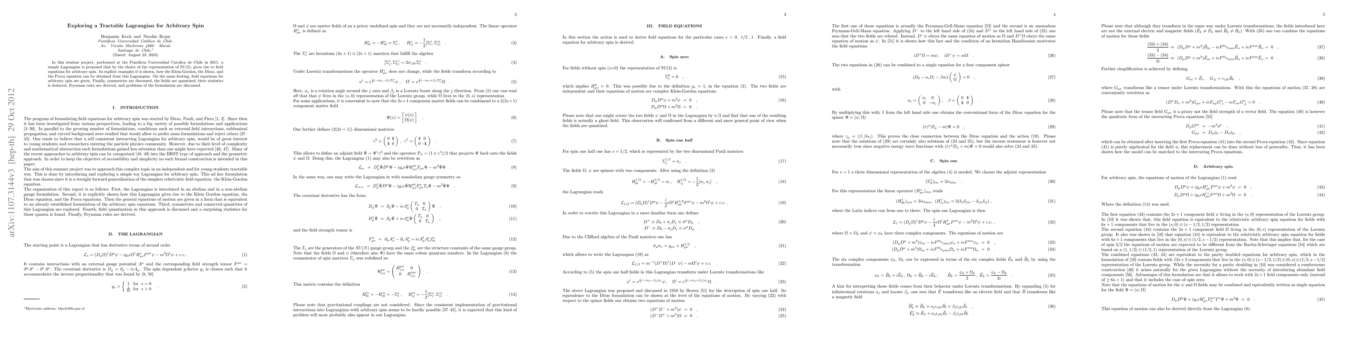 A simple Lagrangian is proposed that by the choice of the representation of SU(2), gives rise to field equations for arbitrary spin. In explicit examples it is shown, how the Klein-Gordon, the Dirac, and the Proca equation can be obtained from this Lagrangian. On the same footing, field equations for arbitrary spin are given. Finally, symmetries are discussed, the fields are quantized, their statistics is deduced, and Feynman rules are derived.