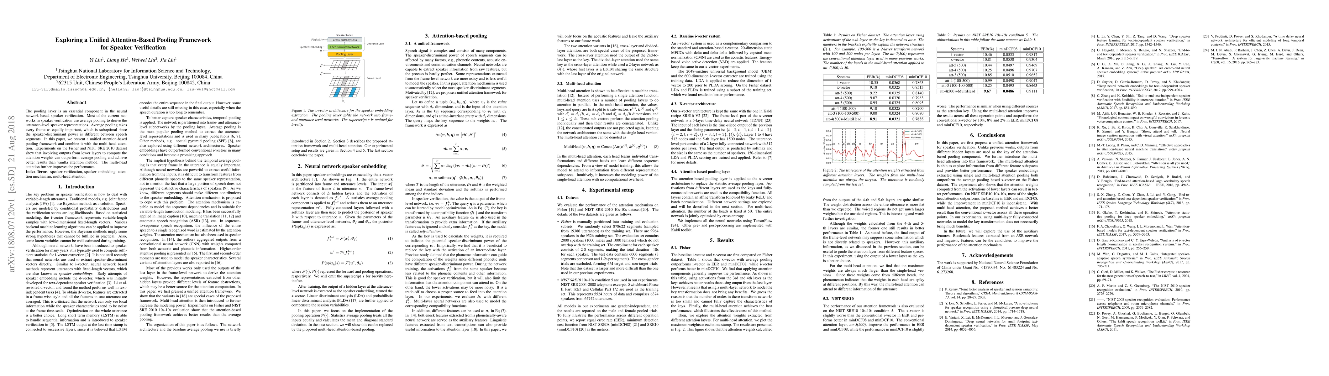 This paper proposes a unified attention-based pooling framework for speaker verification that outperforms traditional average pooling by assigning different weights to speech segments based on their discriminative power. Combining this with multi-head attention further enhances performance, as demonstrated on the Fisher and NIST SRE 2010 datasets.