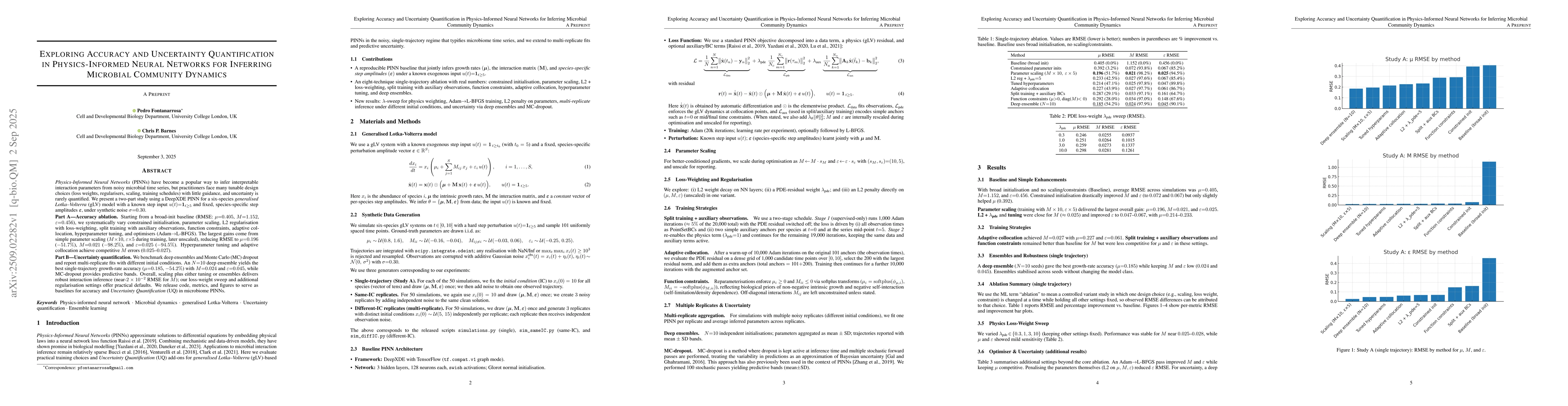 Physics-Informed Neural Networks (PINNs) have become a popular way to infer interpretable interaction parameters from noisy microbial time series, but practitioners face many tunable design choices (loss weights, regularisers, scaling, training schedules) with little guidance, and uncertainty is rarely quantified. We present a two-part study using a DeepXDE PINN for a six-species generalised Lotka-Volterra (gLV) model with a known step input and fixed, species-specific step amplitudes, under synthetic noise. Part A: Accuracy ablation. Starting from a broad-init baseline, we systematically vary constrained initialisation, parameter scaling, L2 regularisation with loss-weighting, split training with auxiliary observations, function constraints, adaptive collocation, hyperparameter tuning, and optimisers (Adam,L-BFGS). The largest gains come from simple parameter scaling. Hyperparameter tuning and adaptive collocation achieve competitive pairwise interaction errors. Part B: Uncertainty quantification. We benchmark deep ensembles and Monte Carlo (MC) dropout and report multi-replicate fits with different initial conditions. An N=10 deep ensemble yields the best single-trajectory growth-rate accuracy, while MC-dropout provides predictive bands. Overall, scaling plus either tuning or ensembles delivers robust interaction inference; our loss-weight sweep and additional regularisation settings offer practical defaults. We release code, metrics, and figures to serve as baselines for accuracy and uncertainty quantification in microbiome PINNs.