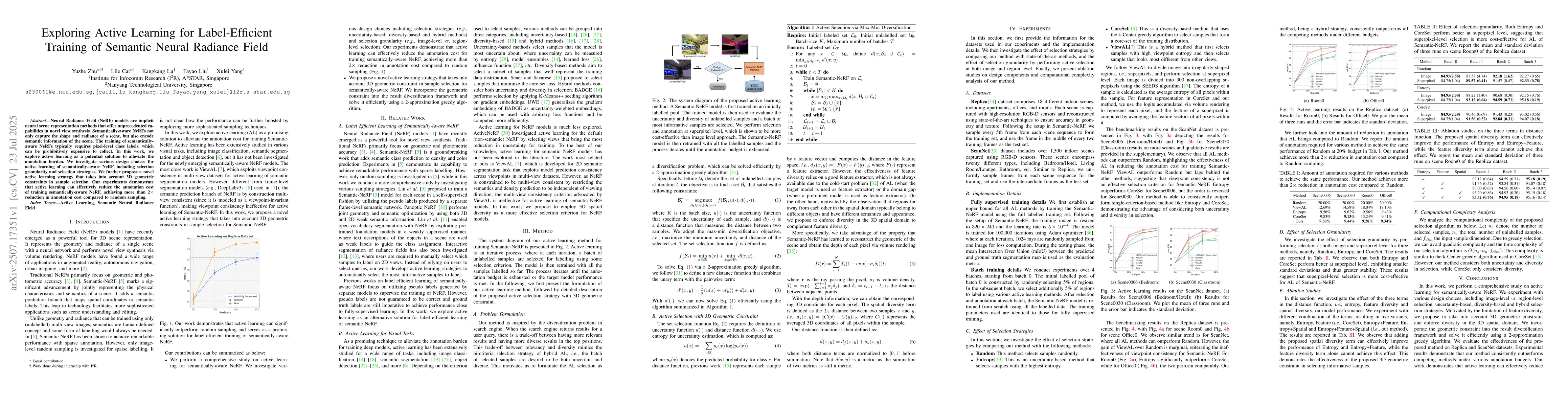Neural Radiance Field (NeRF) models are implicit neural scene representation methods that offer unprecedented capabilities in novel view synthesis. Semantically-aware NeRFs not only capture the shape and radiance of a scene, but also encode semantic information of the scene. The training of semantically-aware NeRFs typically requires pixel-level class labels, which can be prohibitively expensive to collect. In this work, we explore active learning as a potential solution to alleviate the annotation burden. We investigate various design choices for active learning of semantically-aware NeRF, including selection granularity and selection strategies. We further propose a novel active learning strategy that takes into account 3D geometric constraints in sample selection. Our experiments demonstrate that active learning can effectively reduce the annotation cost of training semantically-aware NeRF, achieving more than 2X reduction in annotation cost compared to random sampling.