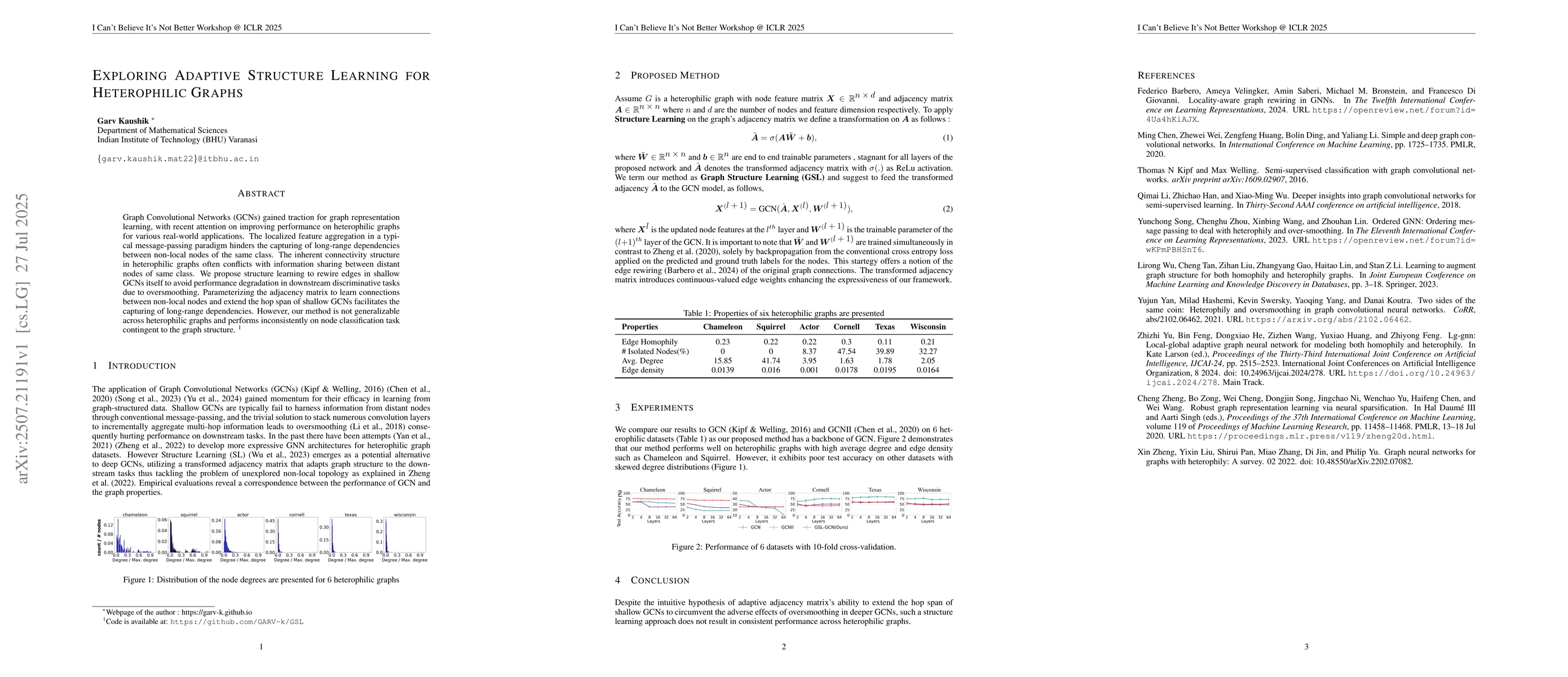 Graph Convolutional Networks (GCNs) gained traction for graph representation learning, with recent attention on improving performance on heterophilic graphs for various real-world applications. The localized feature aggregation in a typical message-passing paradigm hinders the capturing of long-range dependencies between non-local nodes of the same class. The inherent connectivity structure in heterophilic graphs often conflicts with information sharing between distant nodes of same class. We propose structure learning to rewire edges in shallow GCNs itself to avoid performance degradation in downstream discriminative tasks due to oversmoothing. Parameterizing the adjacency matrix to learn connections between non-local nodes and extend the hop span of shallow GCNs facilitates the capturing of long-range dependencies. However, our method is not generalizable across heterophilic graphs and performs inconsistently on node classification task contingent to the graph structure.