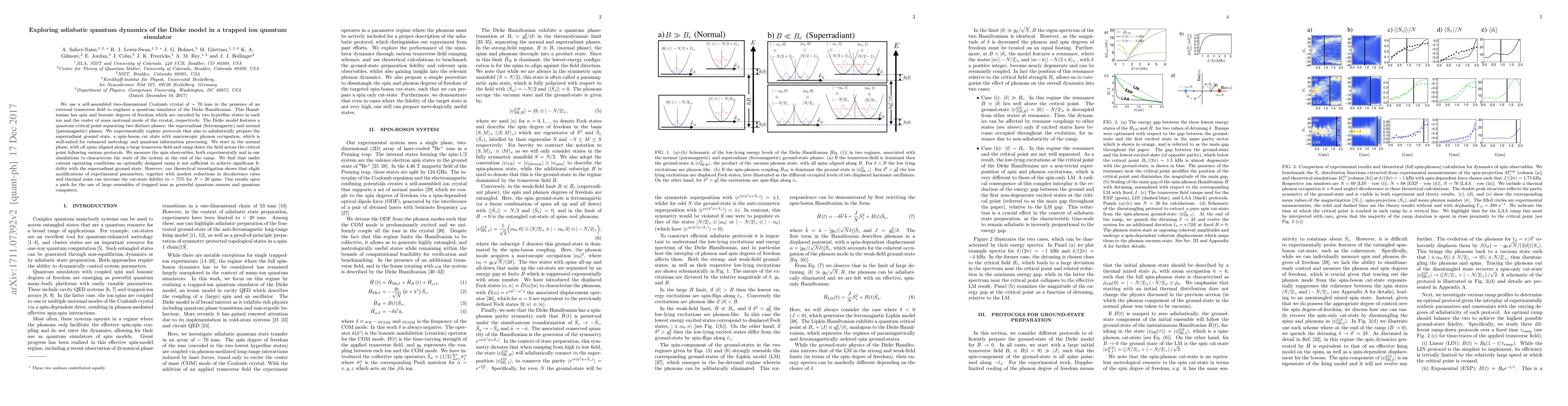 This paper investigates the adiabatic quantum dynamics of the Dicke model using a trapped ion quantum simulator, finding that while current protocols are insufficient for achieving high fidelity with the superradiant ground state, theoretical improvements could boost fidelity to around 75% for 20 spins. The study highlights the potential of large ion ensembles for quantum sensing and computing.