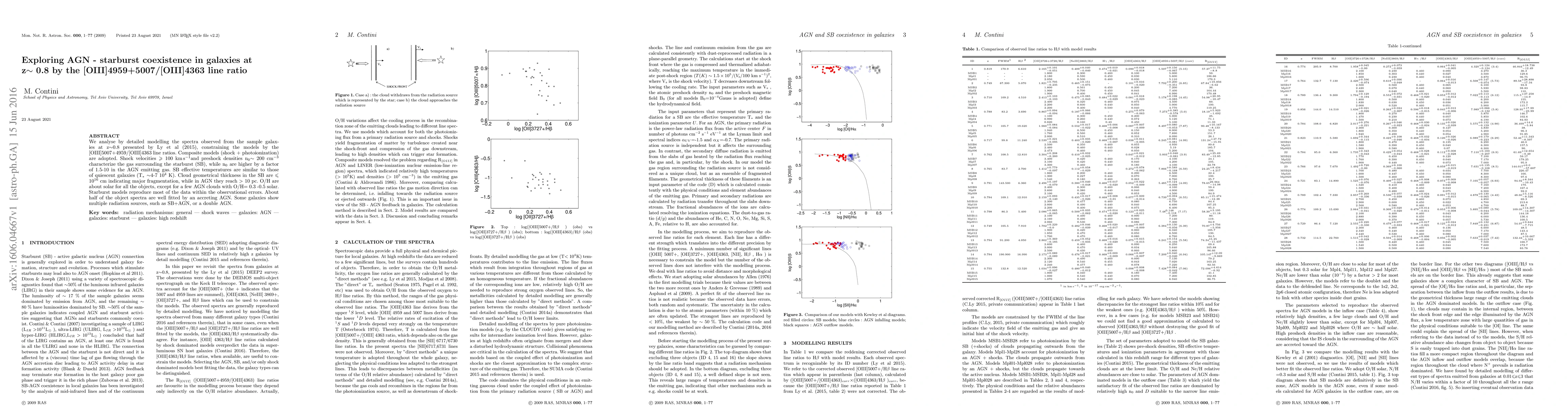 We analyze by detailed modelling the spectra observed from the sample galaxies at z$\sim$0.8 presented by Ly et al (2015), constraining the models by the [OIII]5007+4959/[OIII]4363 line ratios. Composite models accounting for shock and photoionization by AGN or starburst are adopted. O/H are about solar for all the objects, except for a few AGN clouds with O/H= 0.3 -0.5 solar. Starburst models reproduce most of the data within the observational errors. About half of the object spectra are well fitted by an accreting AGN. Some galaxies show multiple radiation sources, such as starburst+AGN, or a double AGN.