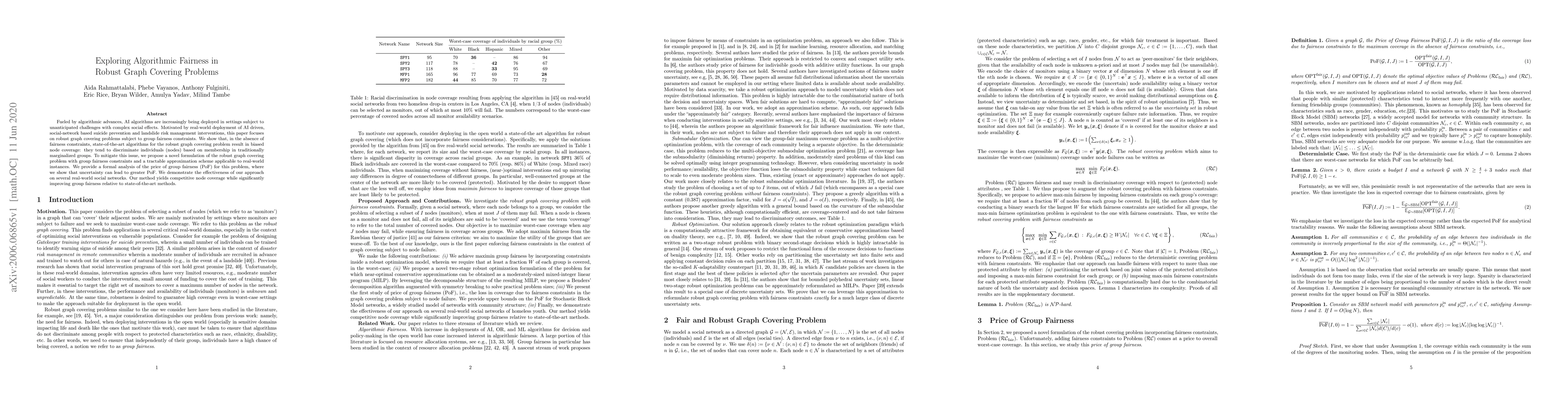 This paper proposes a novel formulation of the robust graph covering problem with group fairness constraints to mitigate algorithmic bias in AI-driven interventions, such as suicide prevention and landslide risk management. The authors introduce a tractable approximation scheme and demonstrate its effectiveness in achieving competitive node coverage while significantly improving group fairness over existing methods.