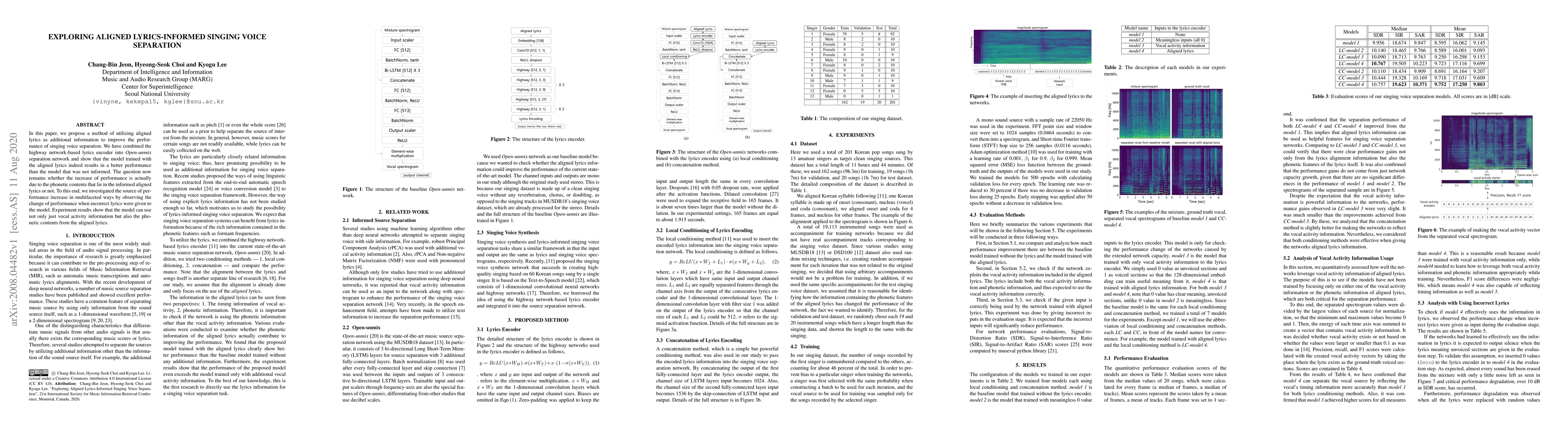 The research proposes a method of utilizing aligned lyrics as additional information to enhance singing voice separation performance by integrating a highway network-based lyrics encoder into the Open-unmix separation network.