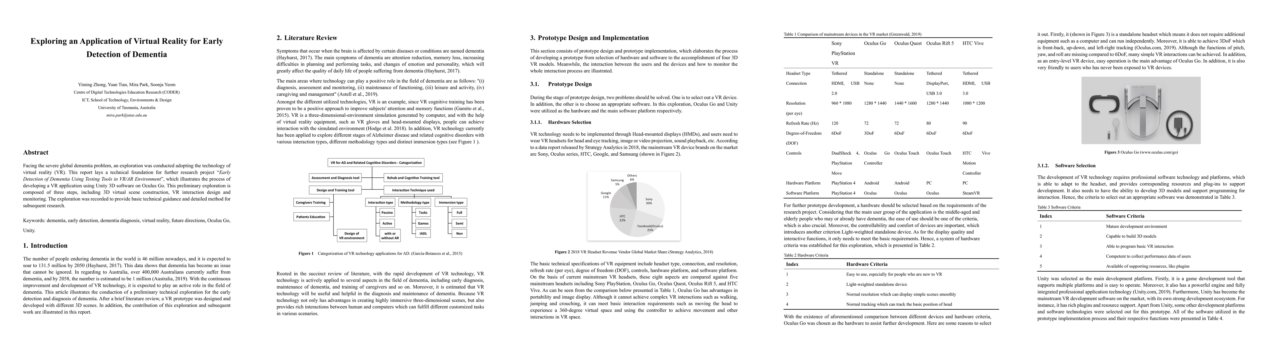 This paper explores the use of virtual reality (VR) for early dementia detection, detailing the development of a VR application in Unity 3D for Oculus Go. The study outlines three main steps: constructing a 3D virtual scene, designing VR interactions, and monitoring the process for future research.