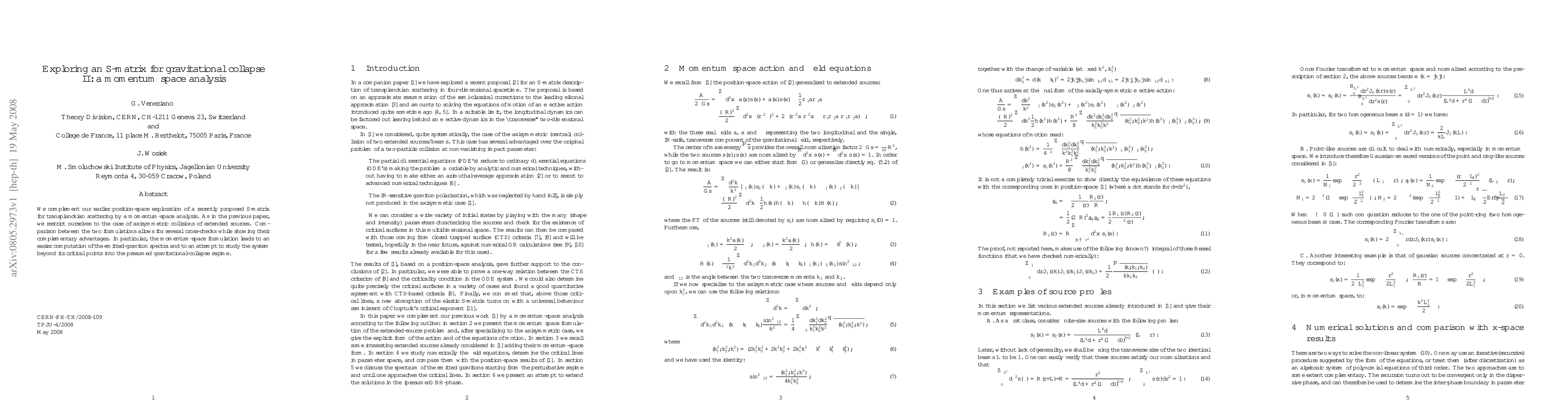 We complement our earlier position-space exploration of a recently proposed S-matrix for transplanckian scattering by a momentum-space analysis. As in the previous paper, we restrict ourselves to the case of axisymmetric collisions of extended sources. Comparison between the two formulations allows for several cross-checks while showing their complementary advantages. In particular, the momentum-space formulation leads to an easier computation of the emitted-graviton spectra and to an attempt to study the system beyond its critical points into the presumed gravitational-collapse regime.