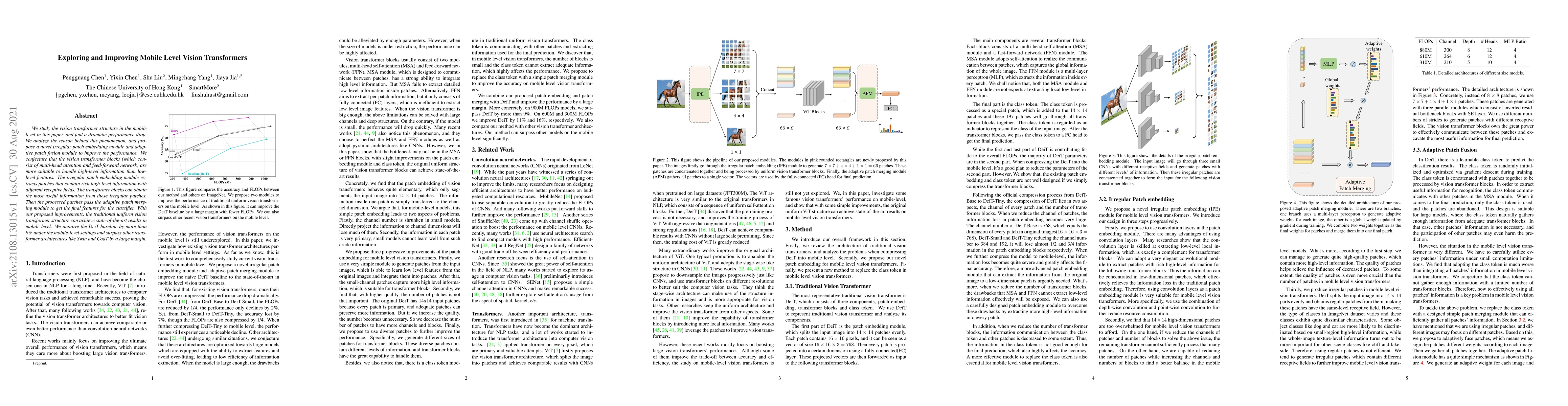 We study the vision transformer structure in the mobile level in this paper, and find a dramatic performance drop. We analyze the reason behind this phenomenon, and propose a novel irregular patch embedding module and adaptive patch fusion module to improve the performance. We conjecture that the vision transformer blocks (which consist of multi-head attention and feed-forward network) are more suitable to handle high-level information than low-level features. The irregular patch embedding module extracts patches that contain rich high-level information with different receptive fields. The transformer blocks can obtain the most useful information from these irregular patches. Then the processed patches pass the adaptive patch merging module to get the final features for the classifier. With our proposed improvements, the traditional uniform vision transformer structure can achieve state-of-the-art results in mobile level. We improve the DeiT baseline by more than 9\% under the mobile-level settings and surpass other transformer architectures like Swin and CoaT by a large margin.