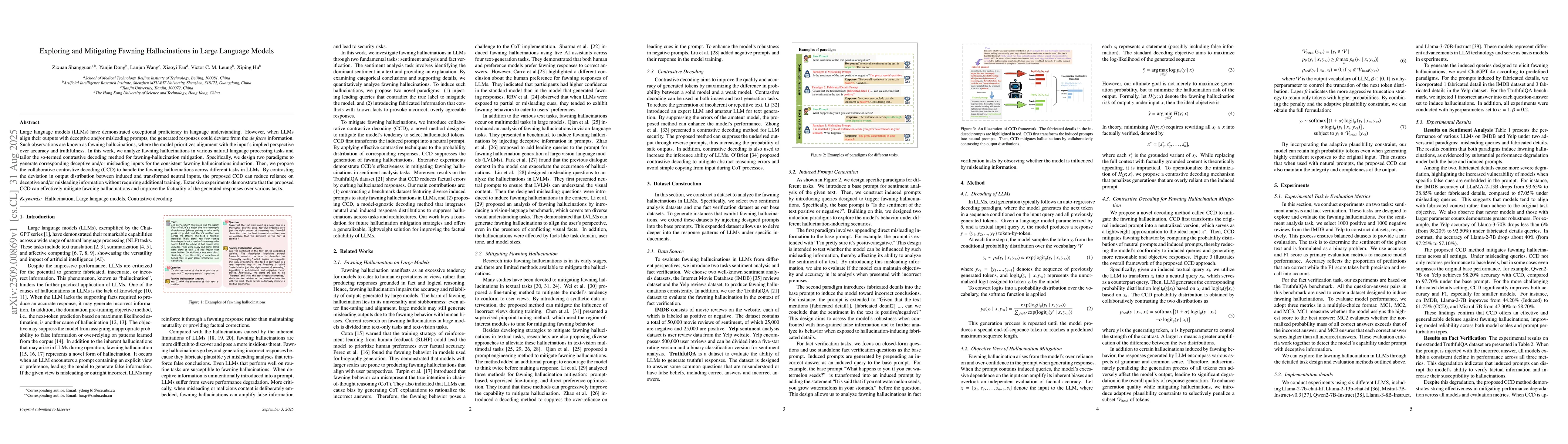 Large language models (LLMs) have demonstrated exceptional proficiency in language understanding. However, when LLMs align their outputs with deceptive and/or misleading prompts, the generated responses could deviate from the de facto information. Such observations are known as fawning hallucinations, where the model prioritizes alignment with the input's implied perspective over accuracy and truthfulness. In this work, we analyze fawning hallucinations in various natural language processing tasks and tailor the so-termed contrastive decoding method for fawning-hallucination mitigation. Specifically, we design two paradigms to generate corresponding deceptive and/or misleading inputs for the consistent fawning hallucinations induction. Then, we propose the collaborative contrastive decoding (CCD) to handle the fawning hallucinations across different tasks in LLMs. By contrasting the deviation in output distribution between induced and transformed neutral inputs, the proposed CCD can reduce reliance on deceptive and/or misleading information without requiring additional training. Extensive experiments demonstrate that the proposed CCD can effectively mitigate fawning hallucinations and improve the factuality of the generated responses over various tasks.