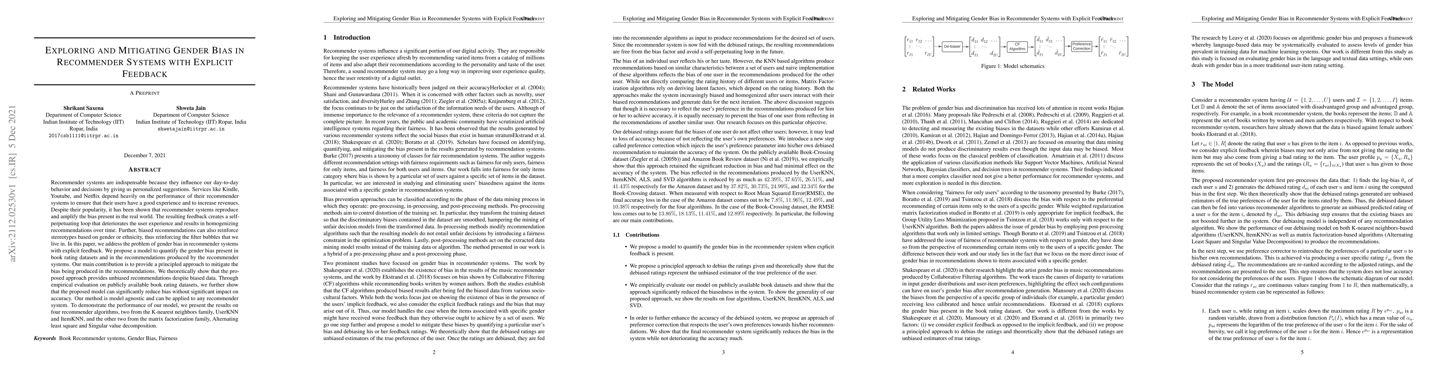 This paper investigates and mitigates gender bias in recommender systems using explicit feedback, proposing a model to quantify and reduce bias in recommendations. The authors demonstrate that their method can significantly reduce bias without compromising recommendation accuracy, applying it to various recommender algorithms.