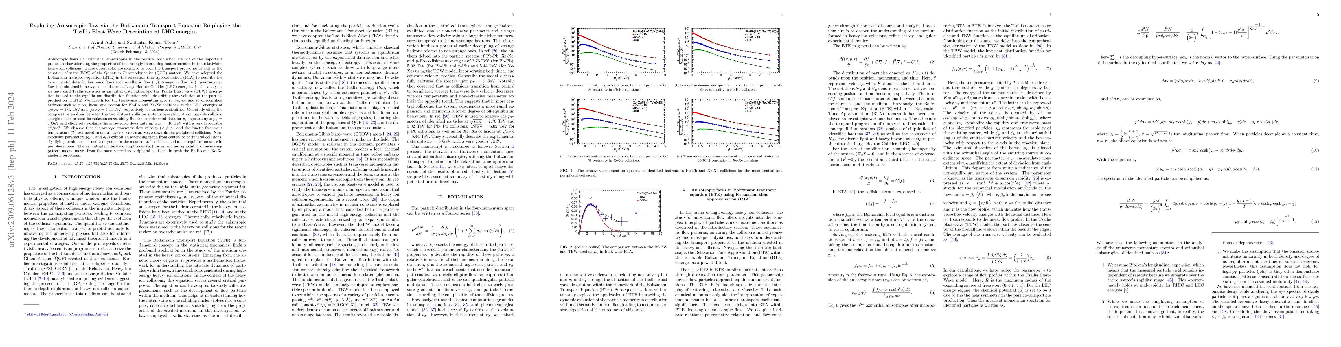 This paper investigates anisotropic flows in relativistic heavy-ion collisions using the Boltzmann Transport Equation with Tsallis Blast Wave description at LHC energies, fitting experimental data for elliptic, triangular, and quadrangular flows. It shows a decreasing trend in average transverse flow velocity and kinetic freeze-out temperature with peripheral collisions, while azimuthal modulation amplitudes increase from central to peripheral.