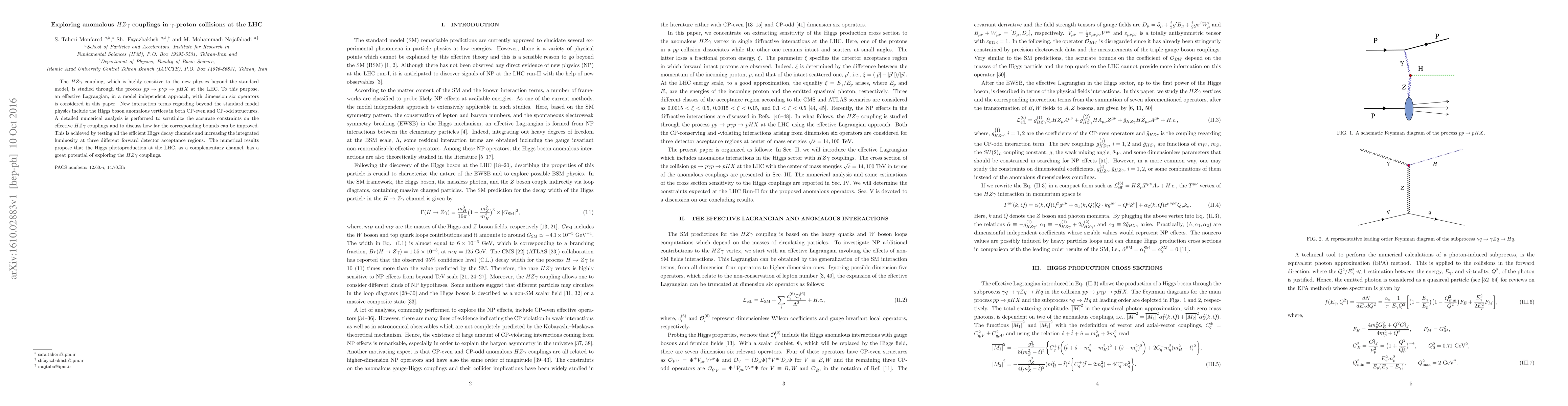 The $HZ\gamma $ coupling, which is highly sensitive to the new physics beyond the standard model, is studied through the process $pp\rightarrow p\gamma p\rightarrow pHX$ at the LHC. To this purpose, an effective Lagrangian, in a model independent approach, with dimension six operators is considered in this paper. New interaction terms regarding beyond the standard model physics include the Higgs boson anomalous vertices in both CP-even and CP-odd structures. A detailed numerical analysis is performed to scrutinize the accurate constraints on the effective $HZ\gamma $ couplings and to discuss how far the corresponding bounds can be improved. This is achieved by testing all the efficient Higgs decay channels and increasing the integrated luminosity at three different forward detector acceptance regions. The numerical results propose that the Higgs photoproduction at the LHC, as a complementary channel, has a great potential of exploring the $HZ\gamma $ couplings.