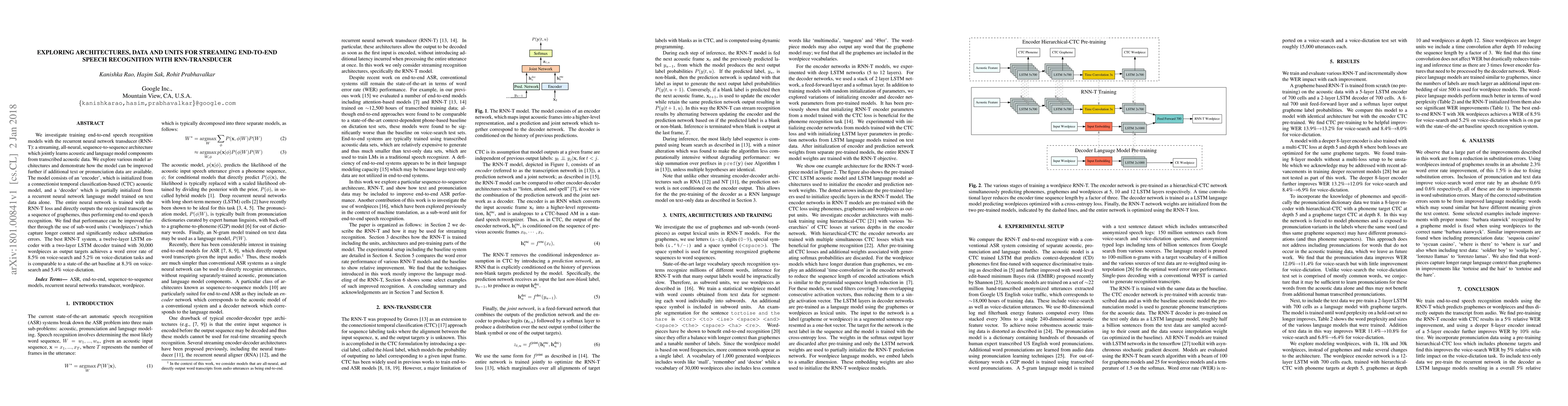 We investigate training end-to-end speech recognition models with the recurrent neural network transducer (RNN-T): a streaming, all-neural, sequence-to-sequence architecture which jointly learns acoustic and language model components from transcribed acoustic data. We explore various model architectures and demonstrate how the model can be improved further if additional text or pronunciation data are available. The model consists of an `encoder', which is initialized from a connectionist temporal classification-based (CTC) acoustic model, and a `decoder' which is partially initialized from a recurrent neural network language model trained on text data alone. The entire neural network is trained with the RNN-T loss and directly outputs the recognized transcript as a sequence of graphemes, thus performing end-to-end speech recognition. We find that performance can be improved further through the use of sub-word units (`wordpieces') which capture longer context and significantly reduce substitution errors. The best RNN-T system, a twelve-layer LSTM encoder with a two-layer LSTM decoder trained with 30,000 wordpieces as output targets achieves a word error rate of 8.5\% on voice-search and 5.2\% on voice-dictation tasks and is comparable to a state-of-the-art baseline at 8.3\% on voice-search and 5.4\% voice-dictation.