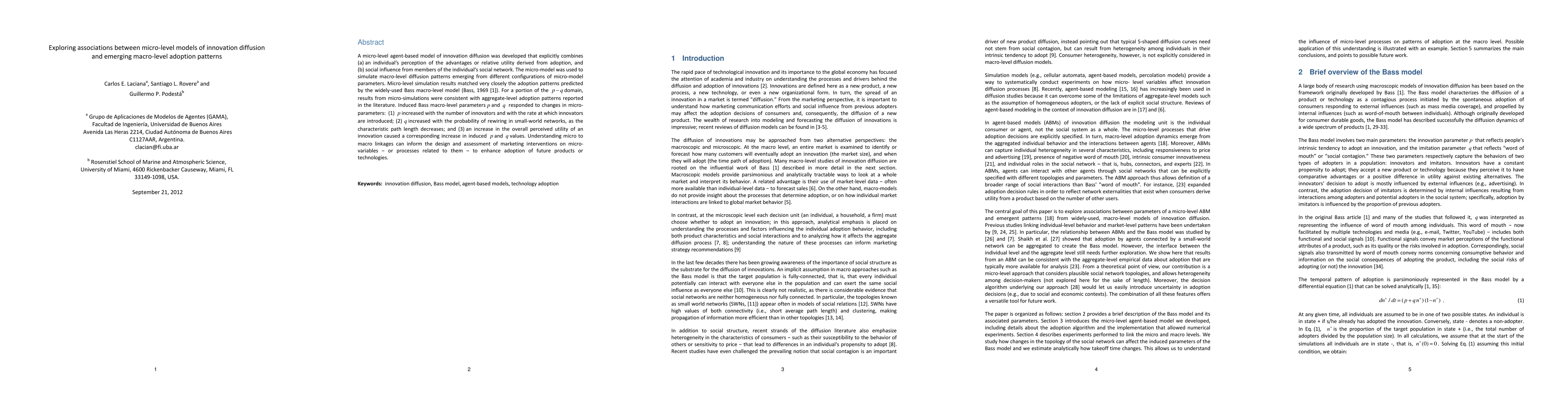 A micro-level agent-based model of innovation diffusion was developed that explicitly combines (a) an individual's perception of the advantages or relative utility derived from adoption, and (b) social influence from members of the individual's social network. The micro-model was used to simulate macro-level diffusion patterns emerging from different configurations of micro-model parameters. Micro-level simulation results matched very closely the adoption patterns predicted by the widely-used Bass macro-level model (Bass, 1969). For a portion of the domain, results from micro-simulations were consistent with aggregate-level adoption patterns reported in the literature. Induced Bass macro-level parameters and responded to changes in micro-parameters: (1) increased with the number of innovators and with the rate at which innovators are introduced; (2) increased with the probability of rewiring in small-world networks, as the characteristic path length decreases; and (3) an increase in the overall perceived utility of an innovation caused a corresponding increase in induced and values. Understanding micro to macro linkages can inform the design and assessment of marketing interventions on micro-variables - or processes related to them - to enhance adoption of future products or technologies.