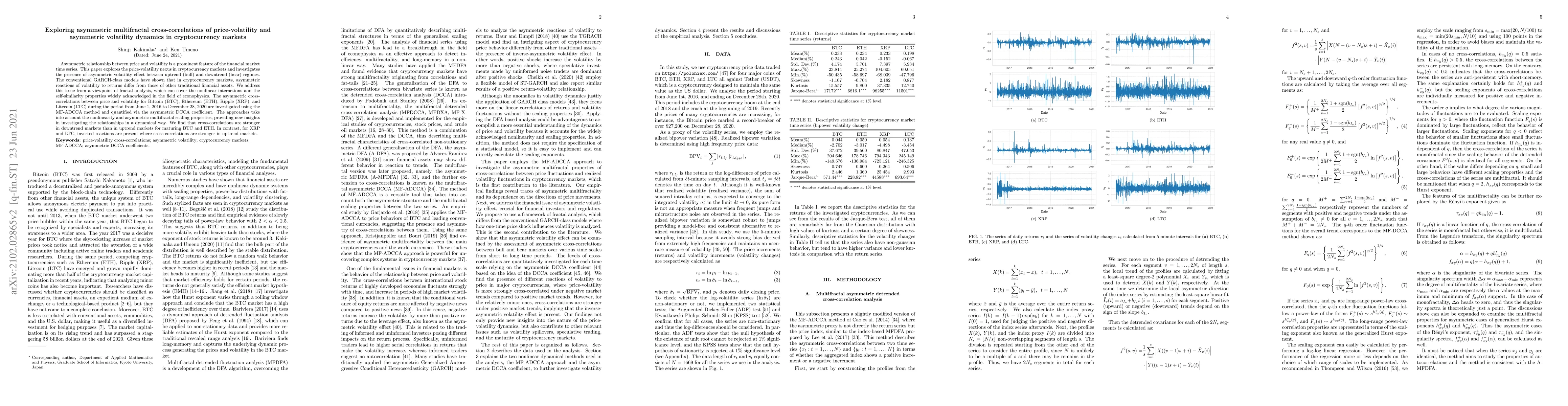 Asymmetric relationship between price and volatility is a prominent feature of the financial market time series. This paper explores the price-volatility nexus in cryptocurrency markets and investigates the presence of asymmetric volatility effect between uptrend (bull) and downtrend (bear) regimes. The conventional GARCH-class models have shown that in cryptocurrency markets, asymmetric reactions of volatility to returns differ from those of other traditional financial assets. We address this issue from a viewpoint of fractal analysis, which can cover the nonlinear interactions and the self-similarity properties widely acknowledged in the field of econophysics. The asymmetric cross-correlations between price and volatility for Bitcoin (BTC), Ethereum (ETH), Ripple (XRP), and Litecoin (LTC) during the period from June 1, 2016 to December 28, 2020 are investigated using the MF-ADCCA method and quantified via the asymmetric DCCA coefficient. The approaches take into account the nonlinearity and asymmetric multifractal scaling properties, providing new insights in investigating the relationships in a dynamical way. We find that cross-correlations are stronger in downtrend markets than in uptrend markets for maturing BTC and ETH. In contrast, for XRP and LTC, inverted reactions are present where cross-correlations are stronger in uptrend markets.