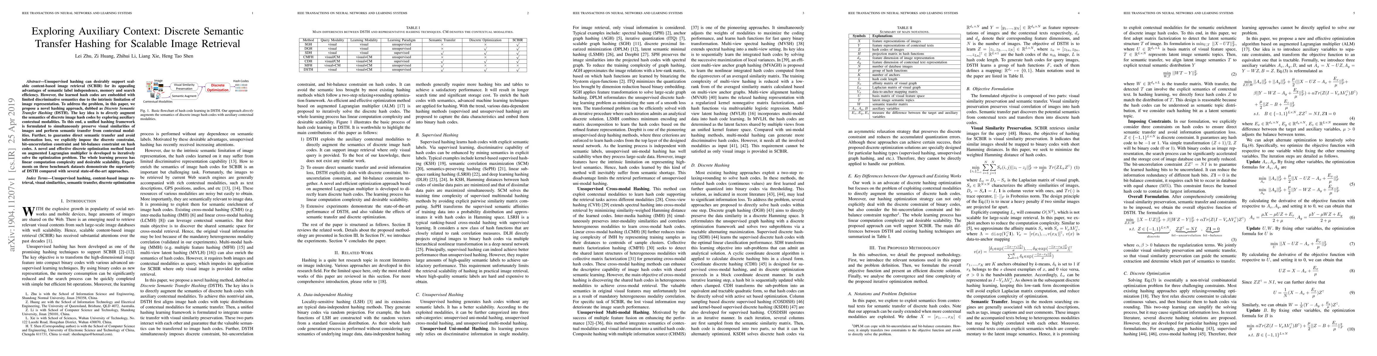 This paper proposes Discrete Semantic Transfer Hashing (DSTH) for scalable image retrieval, aiming to enhance hash codes with richer semantics by leveraging auxiliary contextual modalities. The method imposes discrete, bit-uncorrelation, and bit-balance constraints to ensure effective semantic transfer, achieving linear computation complexity and outperforming state-of-the-art approaches in experiments.