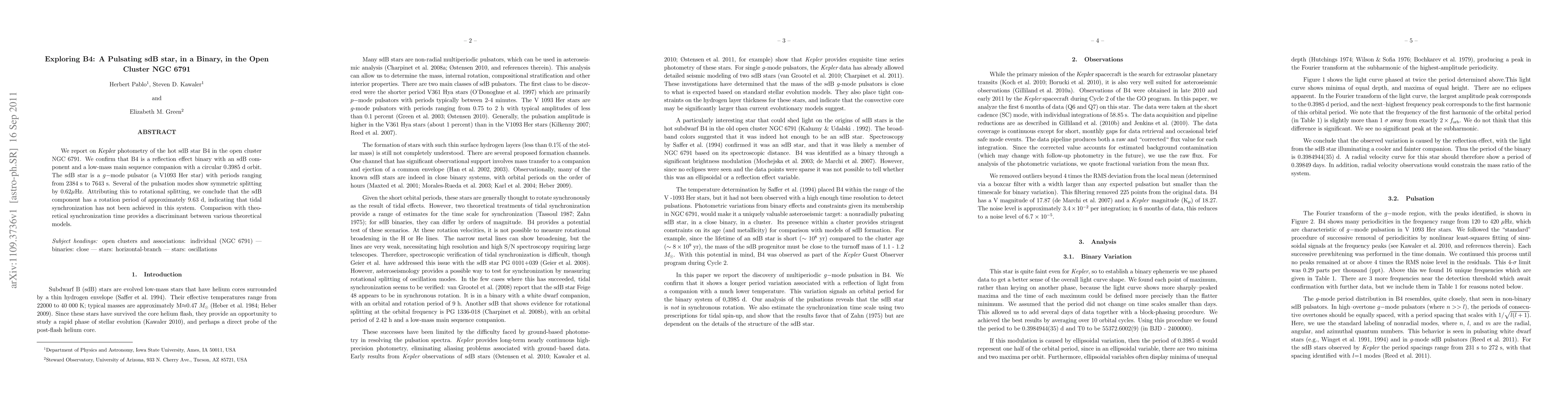 This paper reports on Kepler photometry of the sdB star B4 in NGC 6791, confirming it as a reflection effect binary with a low-mass companion and identifying it as a g-mode pulsator with rotational splitting, indicating a non-synchronized rotation period of approximately 9.63 days. The findings help discriminate between theoretical synchronization models.