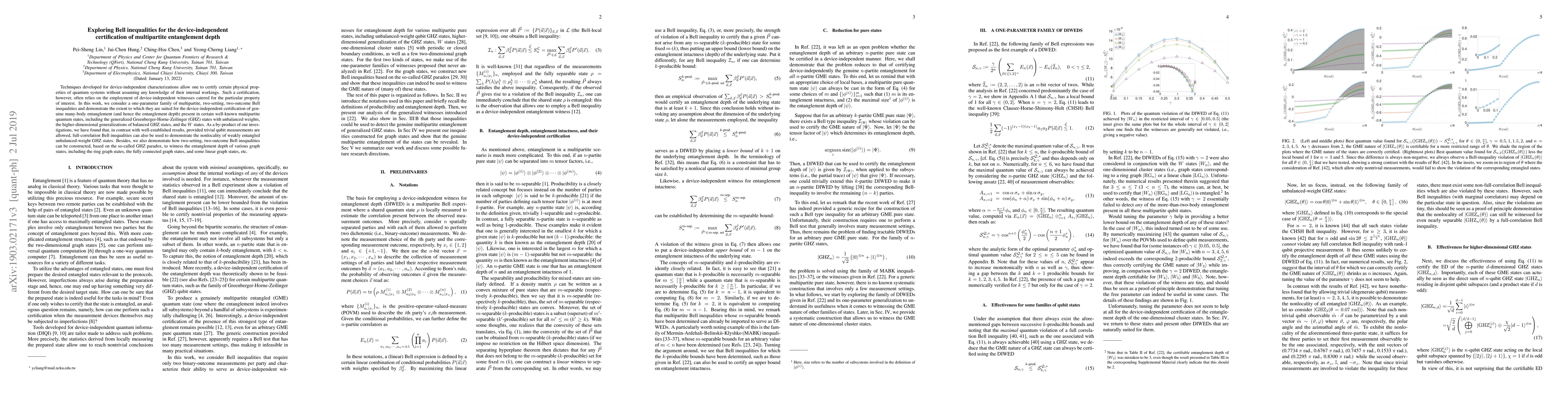 Techniques developed for device-independent characterizations allow one to certify certain physical properties of quantum systems without assuming any knowledge of their internal workings. Such a certification, however, often relies on the employment of device-independent witnesses catered for the particular property of interest. In this work, we consider a one-parameter family of multipartite, two-setting, two-outcome Bell inequalities and demonstrate the extent to which they are suited for the device-independent certification of genuine many-body entanglement (and hence the entanglement depth) present in certain well-known multipartite quantum states, including the generalized Greenberger-Horne-Zeilinger (GHZ) states with unbalanced weights, the higher-dimensional generalizations of balanced GHZ states, and the $W$ states. As a by-product of our investigations, we have found that, in contrast with well-established results, provided trivial qubit measurements are allowed, full-correlation Bell inequalities can also be used to demonstrate the nonlocality of weakly entangled unbalanced-weight GHZ states. Besides, we also demonstrate how two-setting, two-outcome Bell inequalities can be constructed, based on the so-called GHZ paradox, to witness the entanglement depth of various graph states, including the ring graph states, the fully connected graph states, and some linear graph states, etc.