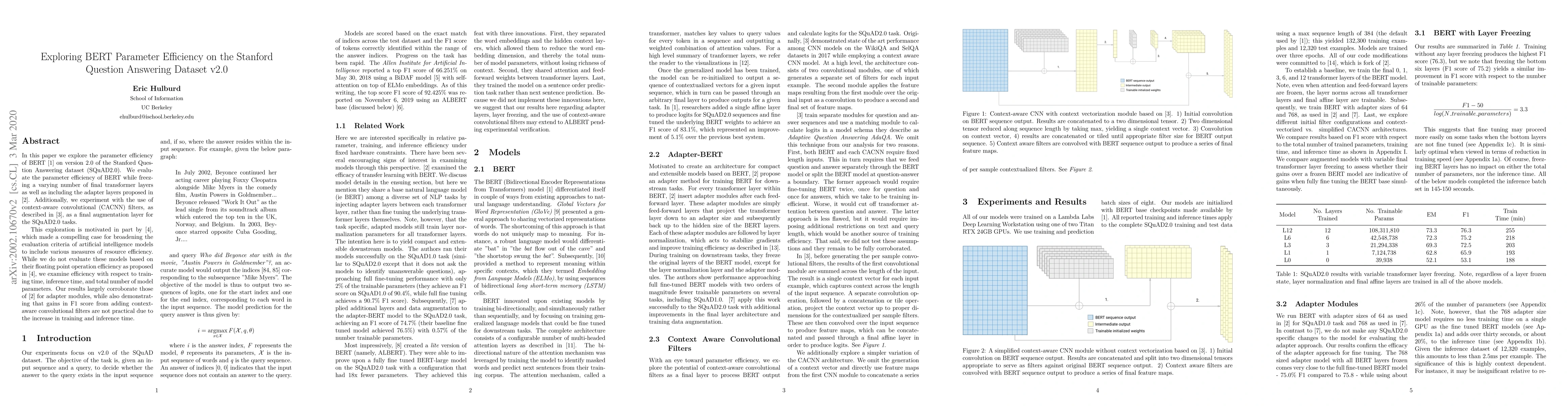In this paper we explore the parameter efficiency of BERT arXiv:1810.04805 on version 2.0 of the Stanford Question Answering dataset (SQuAD2.0). We evaluate the parameter efficiency of BERT while freezing a varying number of final transformer layers as well as including the adapter layers proposed in arXiv:1902.00751. Additionally, we experiment with the use of context-aware convolutional (CACNN) filters, as described in arXiv:1709.08294v3, as a final augmentation layer for the SQuAD2.0 tasks. This exploration is motivated in part by arXiv:1907.10597, which made a compelling case for broadening the evaluation criteria of artificial intelligence models to include various measures of resource efficiency. While we do not evaluate these models based on their floating point operation efficiency as proposed in arXiv:1907.10597, we examine efficiency with respect to training time, inference time, and total number of model parameters. Our results largely corroborate those of arXiv:1902.00751 for adapter modules, while also demonstrating that gains in F1 score from adding context-aware convolutional filters are not practical due to the increase in training and inference time.