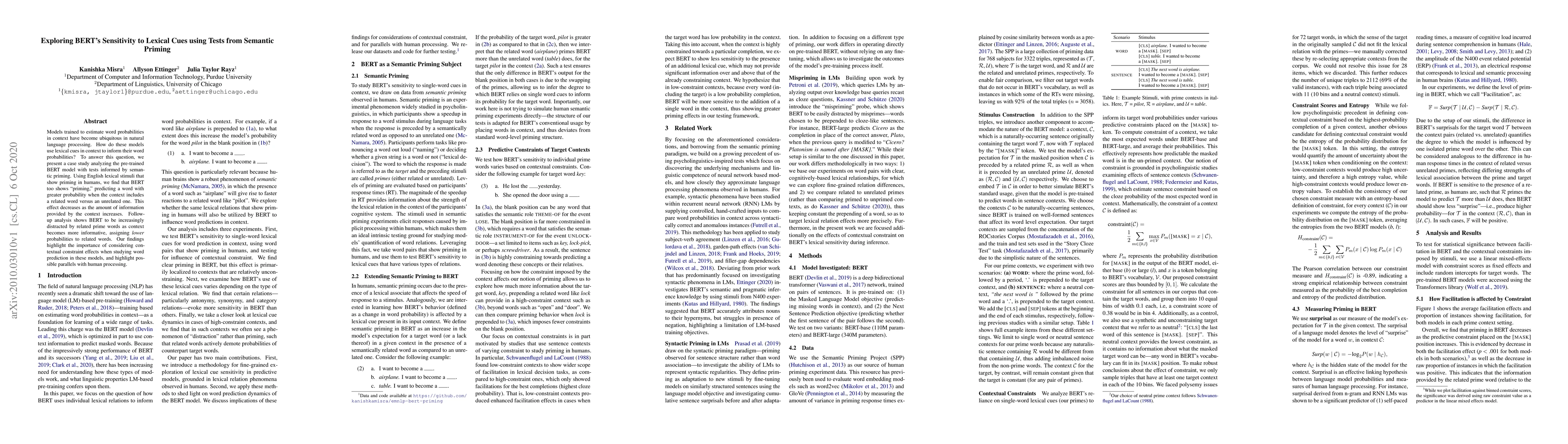 A study uses semantic priming to analyze how BERT predicts word probabilities in context, finding that it relies on lexical cues but becomes distracted by related words as context increases.