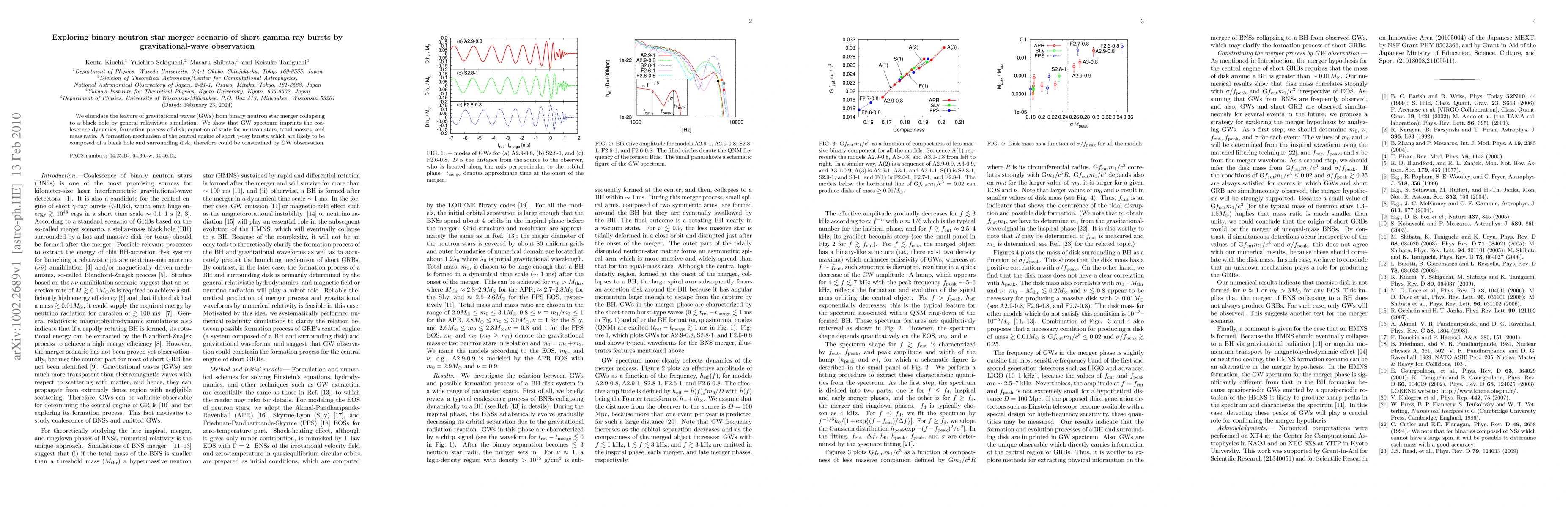 We elucidate the feature of gravitational waves (GWs) from binary neutron star merger collapsing to a black hole by general relativistic simulation. We show that GW spectrum imprints the coalescence dynamics, formation process of disk, equation of state for neutron stars, total masses, and mass ratio. A formation mechanism of the central engine of short $\gamma$-ray bursts, which are likely to be composed of a black hole and surrounding disk, therefore could be constrained by GW observation.
