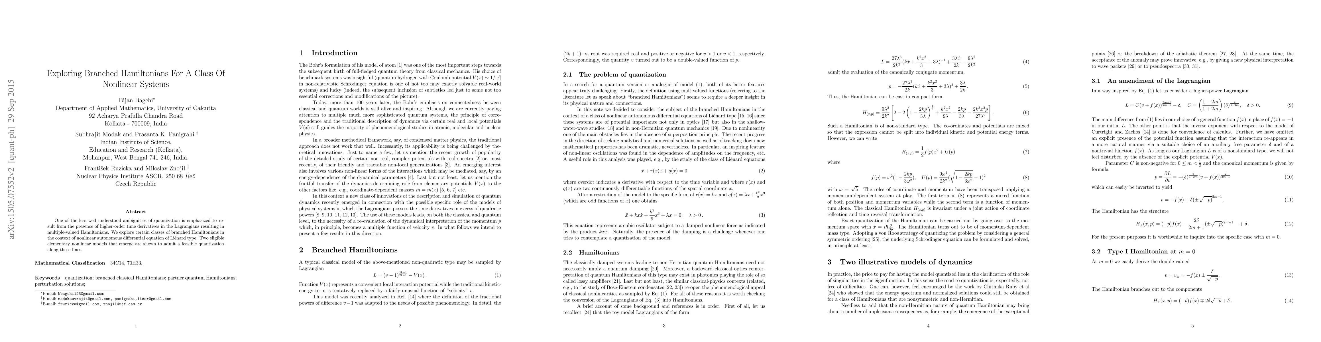One of the less well understood ambiguities of quantization is emphasized to result from the presence of higher-order time derivatives in the Lagrangians resulting in multiple-valued Hamiltonians. We explore certain classes of branched Hamiltonians in the context of nonlinear autonomous differential equation of Lienard type. Two eligible elementary nonlinear models that emerge are shown to admit a feasible quantization along these lines.