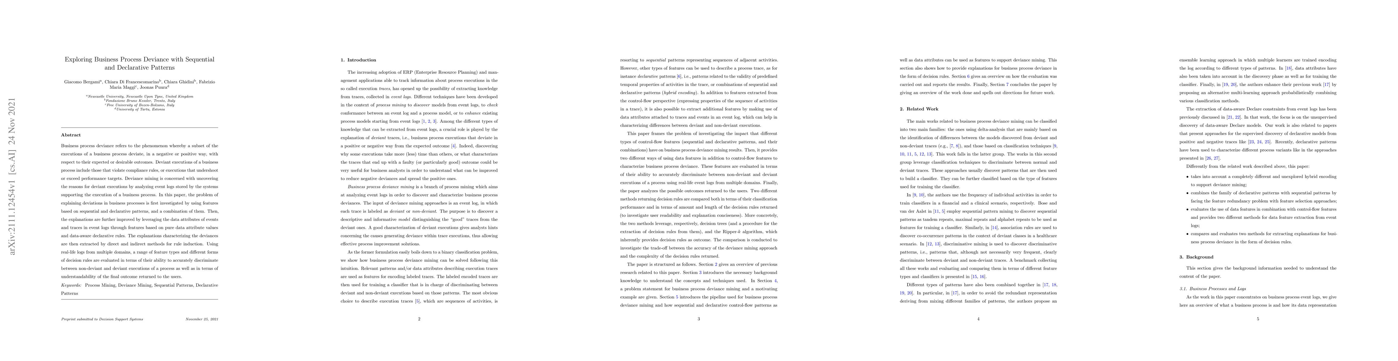 This paper explores business process deviance by analyzing event logs to uncover reasons for deviations using sequential and declarative patterns, supplemented by data attributes. It evaluates various feature types and decision rules for their accuracy and interpretability in distinguishing between normal and deviant executions.