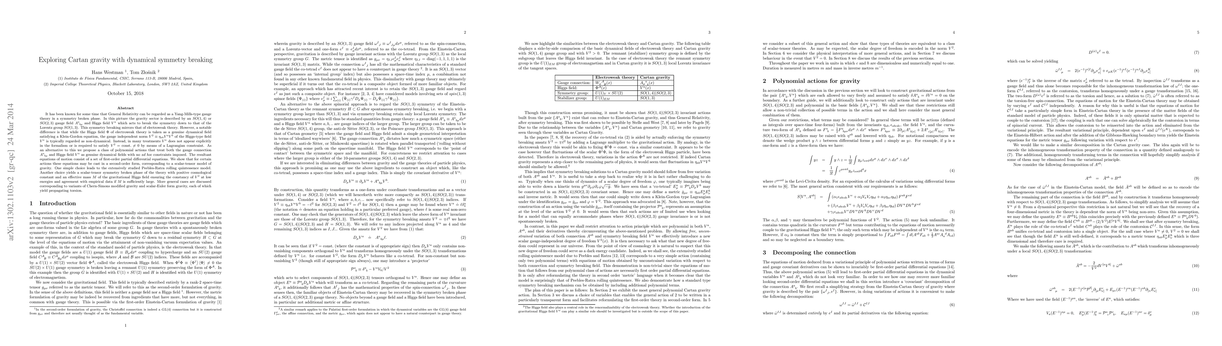 This paper proposes a new approach to Cartan gravity, introducing a dynamical Higgs field that breaks symmetry and leads to a scalar-tensor model of gravity, including variants like Chern-Simons modified gravity and scalar-Euler form gravity.