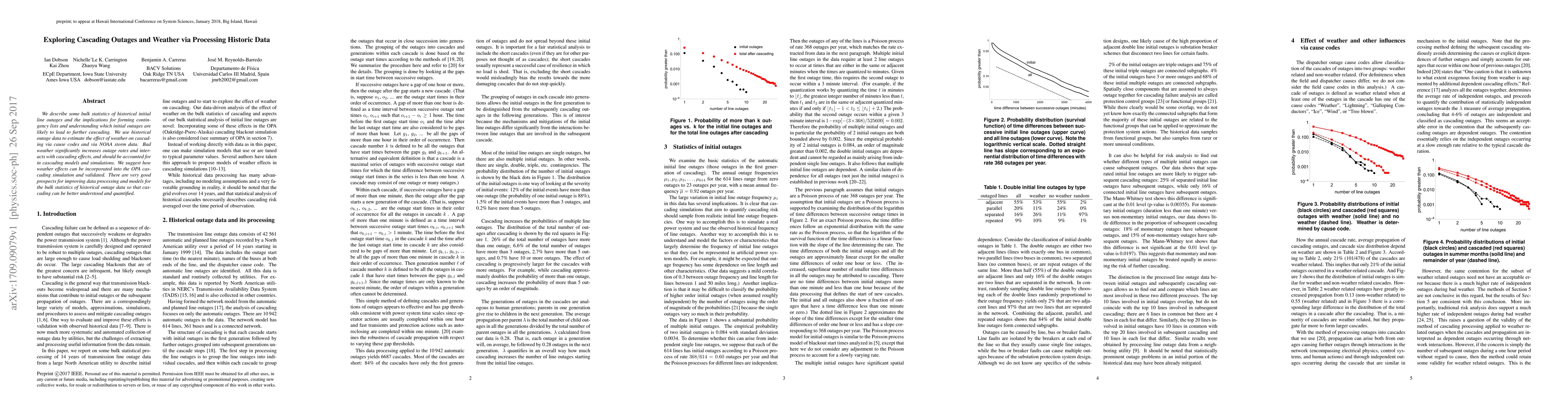 We describe some bulk statistics of historical initial line outages and the implications for forming contingency lists and understanding which initial outages are likely to lead to further cascading. We use historical outage data to estimate the effect of weather on cascading via cause codes and via NOAA storm data. Bad weather significantly increases outage rates and interacts with cascading effects, and should be accounted for in cascading models and simulations. We suggest how weather effects can be incorporated into the OPA cascading simulation and validated. There are very good prospects for improving data processing and models for the bulk statistics of historical outage data so that cascading can be better understood and quantified.