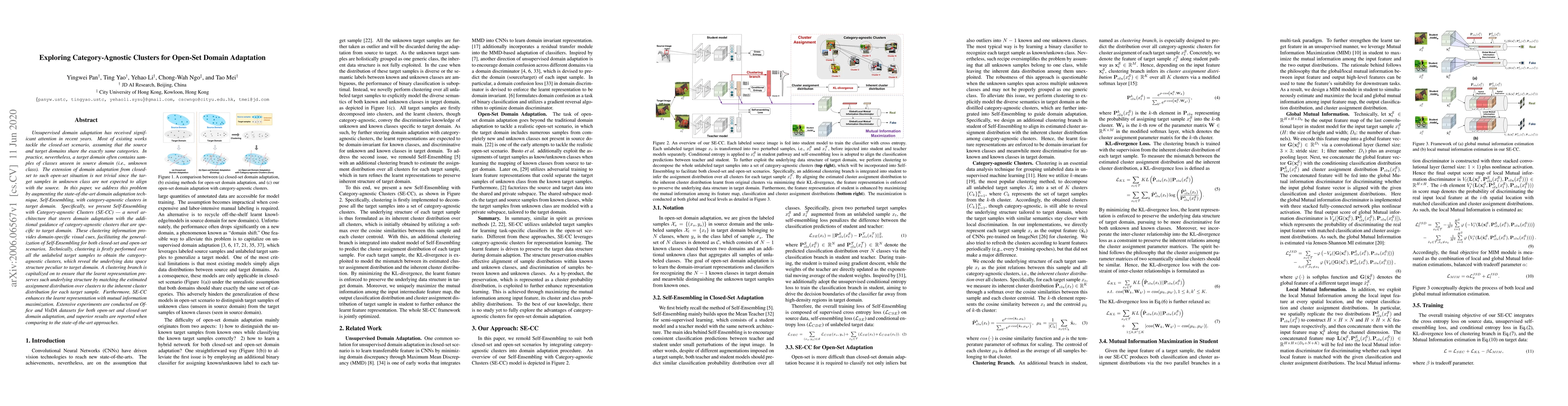 This paper proposes Self-Ensembling with Category-agnostic Clusters (SE-CC) to tackle open-set domain adaptation, where the target domain includes unseen classes. SE-CC leverages category-agnostic clusters in the target domain to enhance domain adaptation, achieving better generalization for both closed-set and open-set scenarios.