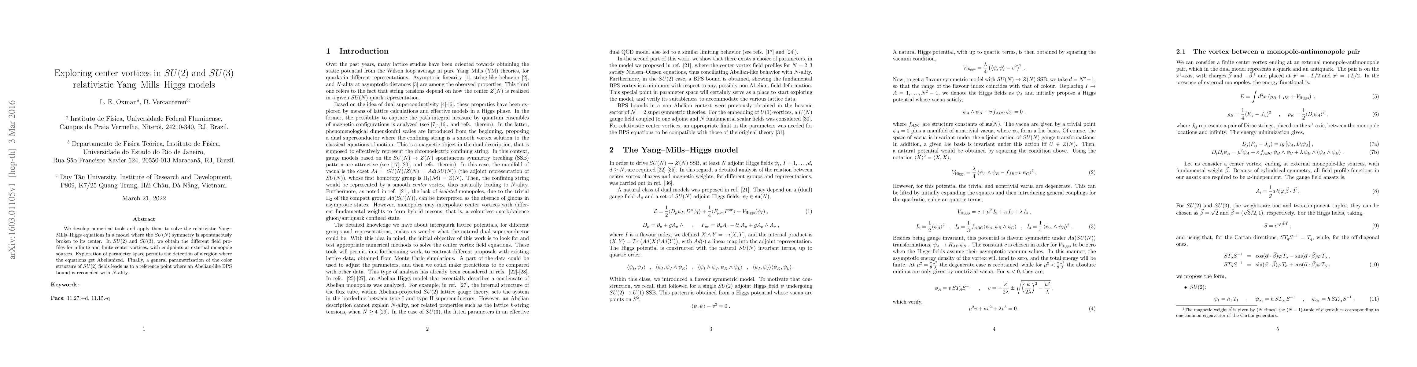 Summary: This research develops numerical tools to explore center vortices in SU(2) and SU(3) Yang-Mills-Higgs models with spontaneous symmetry breaking to their center. The study identifies different field profiles for infinite and finite vortices, discovers a parameter region where the equations become Abelianized, and establishes a parametrization reconciling Abelian-like BPS bounds with N-ality for SU(2) fields.