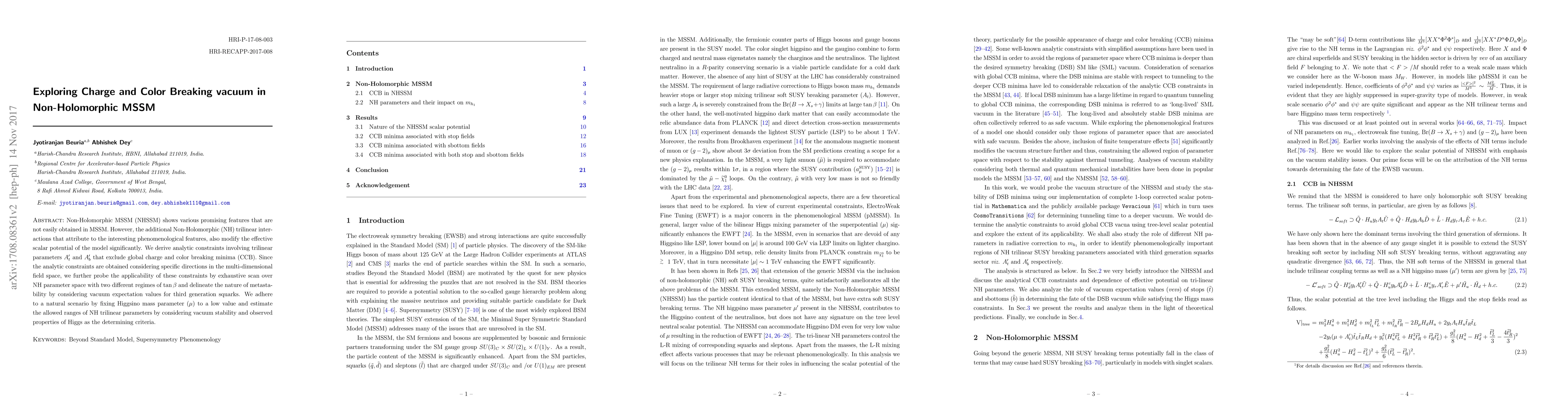 This paper explores the Non-Holomorphic MSSM (NHSSM) model, deriving analytic constraints to exclude charge and color breaking vacua. It examines the impact of NH trilinear interactions on the effective scalar potential and assesses the model's metastability and vacuum stability across different parameter regimes.