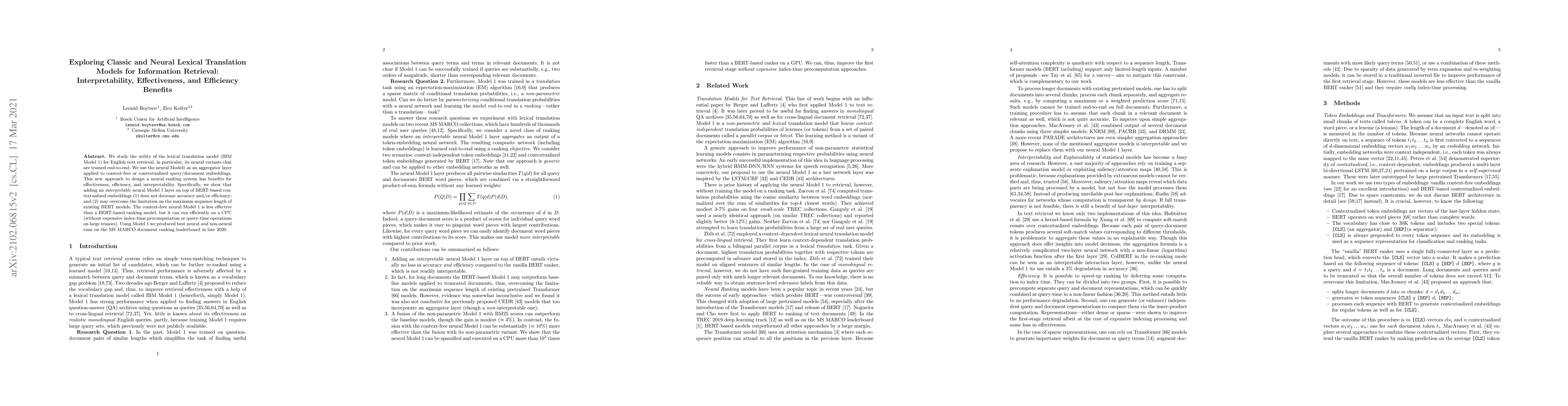 This paper explores the effectiveness of classic and neural lexical translation models for information retrieval, finding benefits in interpretability, effectiveness, and efficiency. It proposes a new approach using a neural Model 1 layer on top of BERT-based embeddings to overcome limitations in existing models.