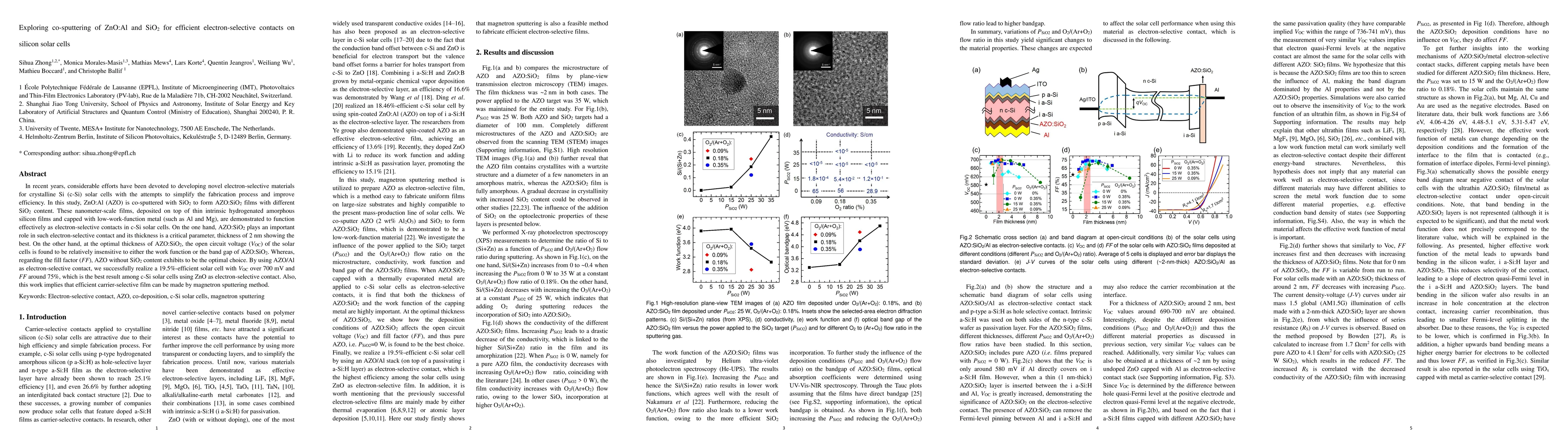 This study explores co-sputtering of ZnO:Al (AZO) with SiO2 to create AZO:SiO2 films for electron-selective contacts in crystalline Si solar cells, achieving optimal efficiency with a 2 nm film thickness. The best performance, a 19.5% efficient solar cell, is achieved using AZO/Al as the electron-selective contact.
