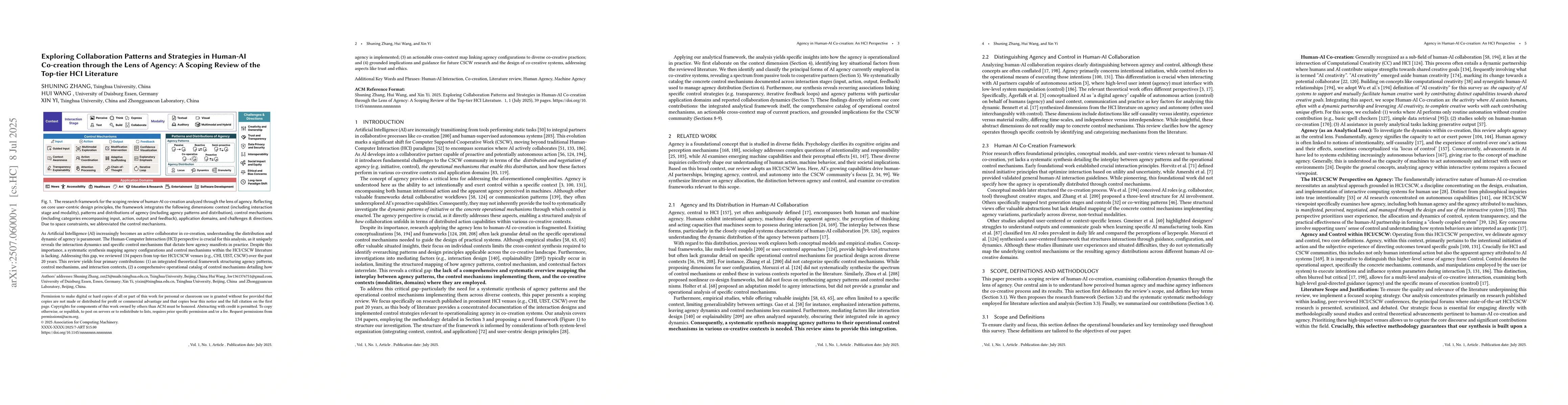 As Artificial Intelligence (AI) increasingly becomes an active collaborator in co-creation, understanding the distribution and dynamic of agency is paramount. The Human-Computer Interaction (HCI) perspective is crucial for this analysis, as it uniquely reveals the interaction dynamics and specific control mechanisms that dictate how agency manifests in practice. Despite this importance, a systematic synthesis mapping agency configurations and control mechanisms within the HCI/CSCW literature is lacking. Addressing this gap, we reviewed 134 papers from top-tier HCI/CSCW venues (e.g., CHI, UIST, CSCW) over the past 20 years. This review yields four primary contributions: (1) an integrated theoretical framework structuring agency patterns, control mechanisms, and interaction contexts, (2) a comprehensive operational catalog of control mechanisms detailing how agency is implemented; (3) an actionable cross-context map linking agency configurations to diverse co-creative practices; and (4) grounded implications and guidance for future CSCW research and the design of co-creative systems, addressing aspects like trust and ethics.