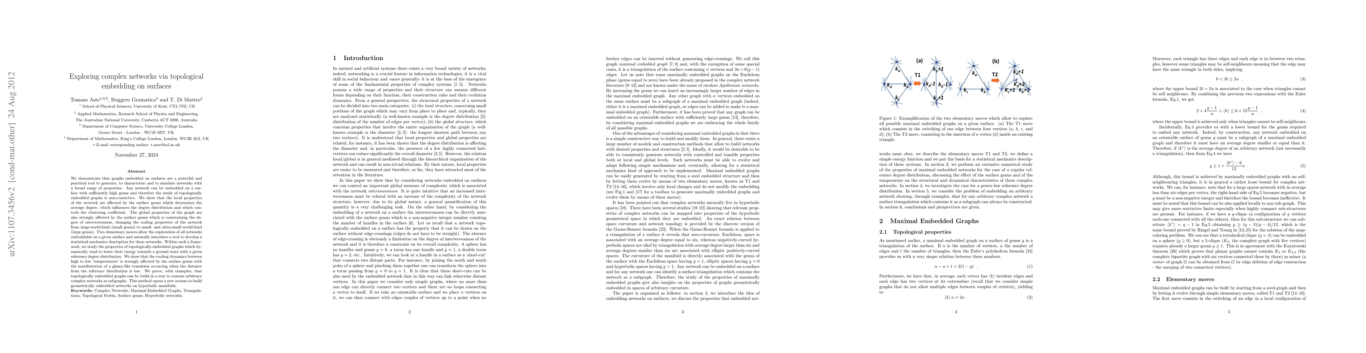 We demonstrate that graphs embedded on surfaces are a powerful and practical tool to generate, characterize and simulate networks with a broad range of properties. Remarkably, the study of topologically embedded graphs is non-restrictive because any network can be embedded on a surface with sufficiently high genus. The local properties of the network are affected by the surface genus which, for example, produces significant changes in the degree distribution and in the clustering coefficient. The global properties of the graph are also strongly affected by the surface genus which is constraining the degree of interwoveness, changing the scaling properties from large-world-kind (small genus) to small- and ultra-small-world-kind (large genus). Two elementary moves allow the exploration of all networks embeddable on a given surface and naturally introduce a tool to develop a statistical mechanics description. Within such a framework, we study the properties of topologically-embedded graphs at high and low `temperatures' observing the formation of increasingly regular structures by cooling the system. We show that the cooling dynamics is strongly affected by the surface genus with the manifestation of a glassy-like freezing transitions occurring when the amount of topological disorder is low.