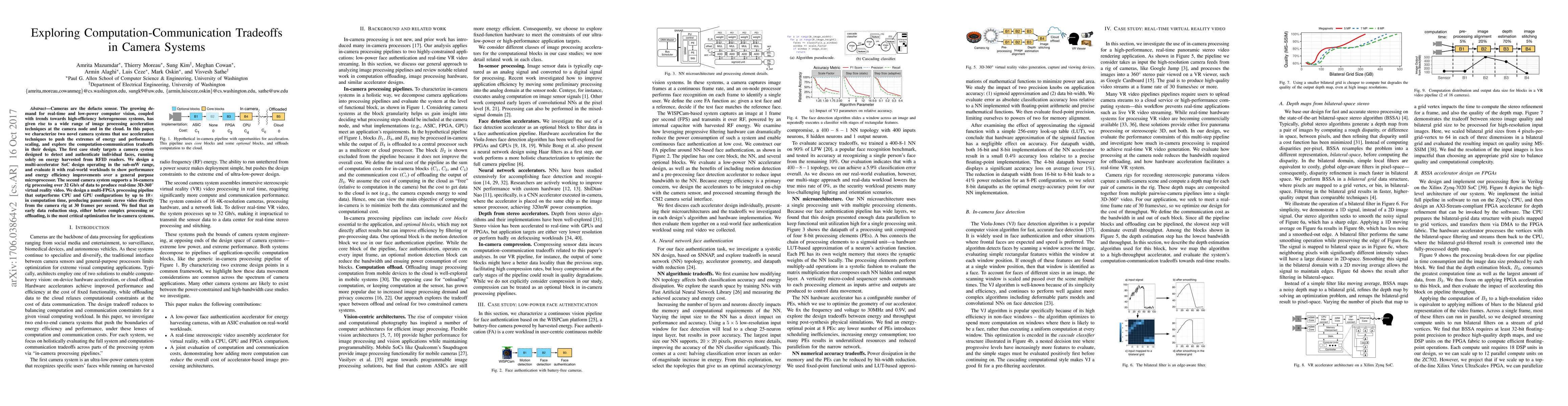 Cameras are the defacto sensor. The growing demand for real-time and low-power computer vision, coupled with trends towards high-efficiency heterogeneous systems, has given rise to a wide range of image processing acceleration techniques at the camera node and in the cloud. In this paper, we characterize two novel camera systems that use acceleration techniques to push the extremes of energy and performance scaling, and explore the computation-communication tradeoffs in their design. The first case study targets a camera system designed to detect and authenticate individual faces, running solely on energy harvested from RFID readers. We design a multi-accelerator SoC design operating in the sub-mW range, and evaluate it with real-world workloads to show performance and energy efficiency improvements over a general purpose microprocessor. The second camera system supports a 16-camera rig processing over 32 Gb/s of data to produce real-time 3D-360 degree virtual reality video. We design a multi-FPGA processing pipeline that outperforms CPU and GPU configurations by up to 10x in computation time, producing panoramic stereo video directly from the camera rig at 30 frames per second. We find that an early data reduction step, either before complex processing or offloading, is the most critical optimization for in-camera systems.