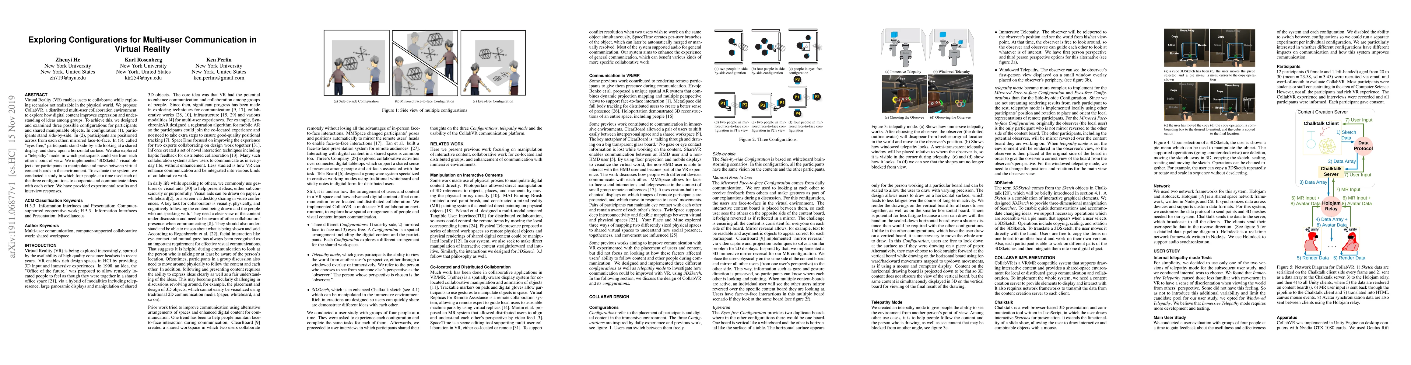 This paper proposes CollabVR, a multi-user collaboration environment in VR, and explores three configurations for group interaction: side-by-side, mirrored face-to-face, and eyes-free. The study evaluates these setups using 3DSketch objects and provides insights from experimental results and participant interviews.