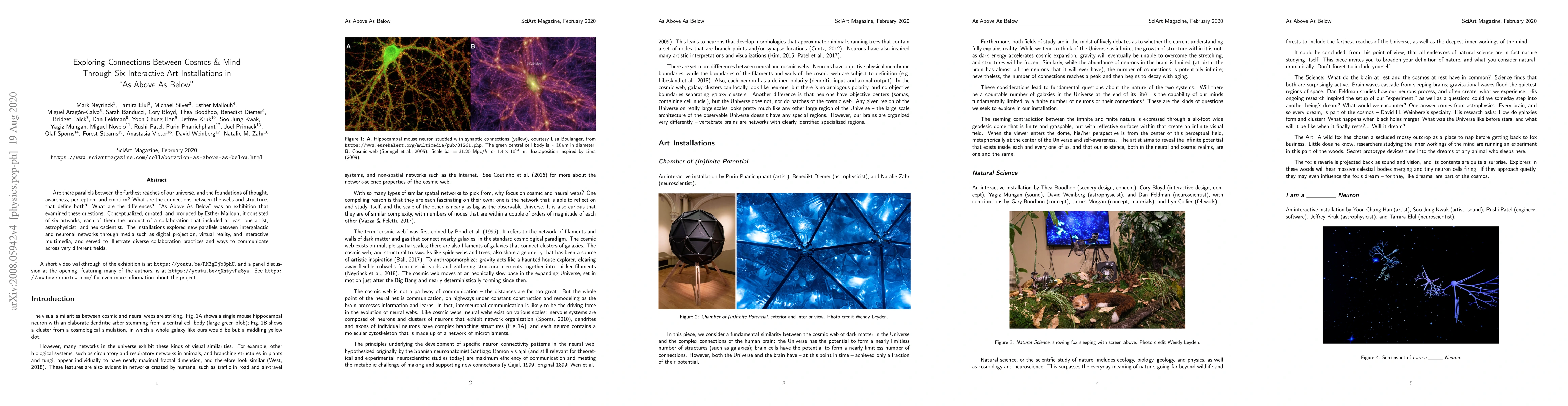 Are there parallels between the furthest reaches of our universe, and the foundations of thought, awareness, perception, and emotion? What are the connections between the webs and structures that define both? What are the differences? "As Above As Below" was an exhibition that examined these questions. It consisted of six artworks, each of them the product of a collaboration that included at least one artist, astrophysicist, and neuroscientist. The installations explored new parallels between intergalactic and neuronal networks through media such as digital projection, virtual reality, and interactive multimedia, and served to illustrate diverse collaboration practices and ways to communicate across very different fields.