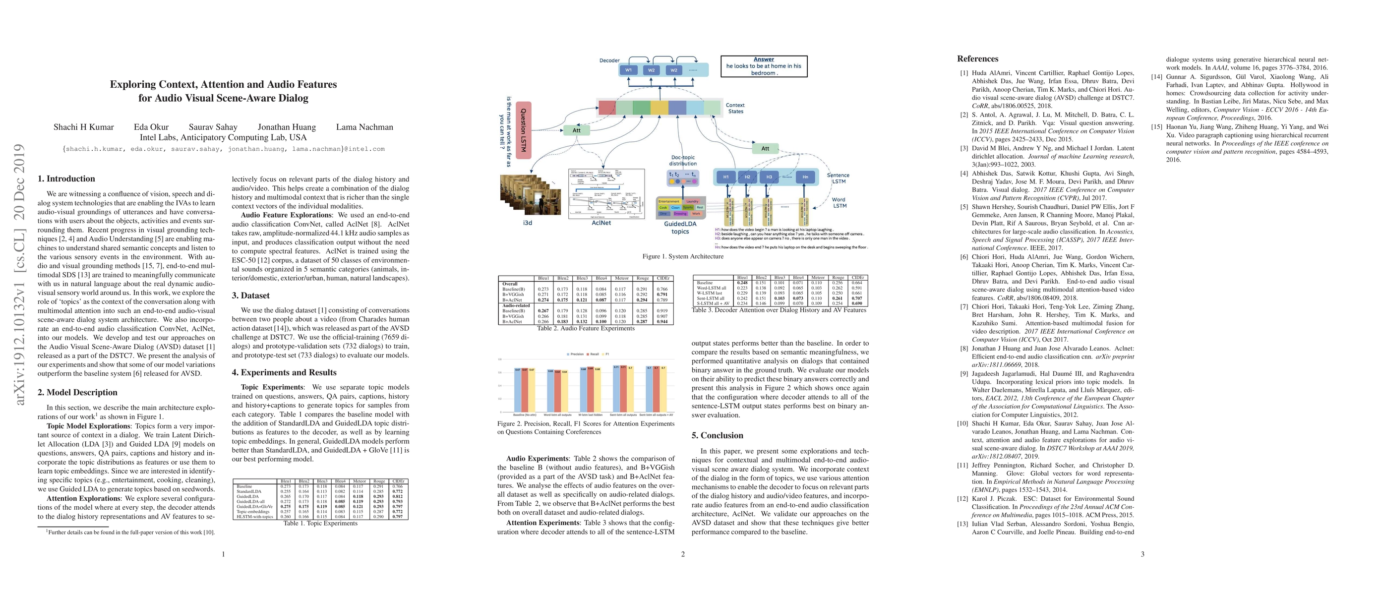 This paper investigates the integration of context, attention mechanisms, and audio features into an audio-visual scene-aware dialog system, employing a ConvNet for audio classification. Experiments on the AVSD dataset demonstrate that certain model variations outperform the baseline.