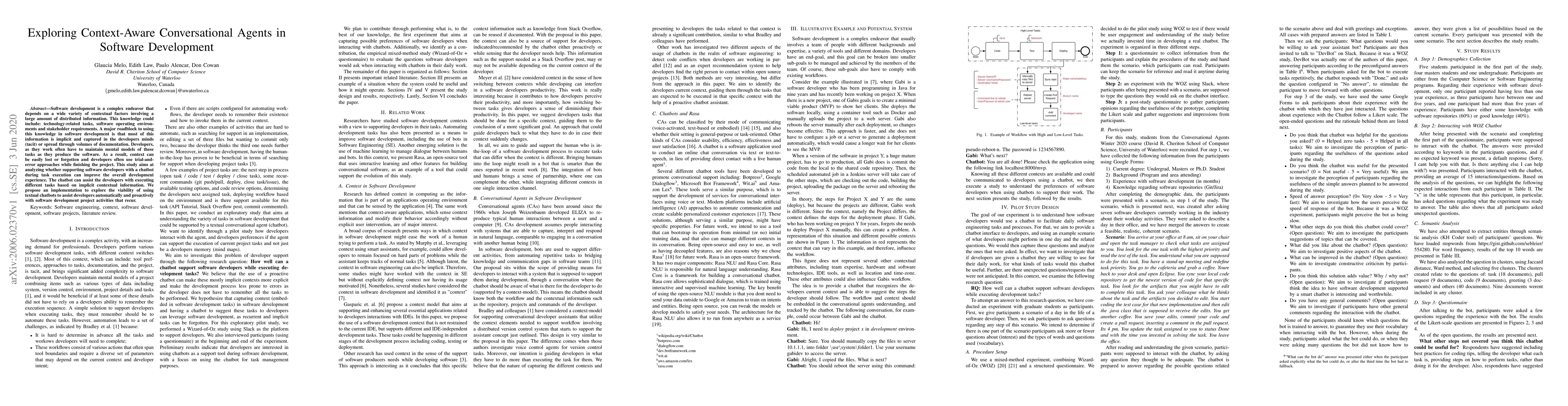 Software development is a complex endeavor that depends on a wide variety of contextual factors involving a large amount of distributed information. This knowledge could include: technology-related tasks, software operating environments and stakeholder requirements. A major roadblock to using this knowledge in software development is that most of this information is implicit and captured in the developers' minds (tacit) or spread through volumes of documentation. Developers, as they work often have to maintain mental models of these tasks as they produce the software. As a result, context can be easily lost or forgotten and developers often use trial-and-error approaches while finishing the project. This study aims at analyzing whether supporting software developers with a chatbot during task execution can improve the overall development experience. The chatbot can assist the developers in executing different tasks based on implicit contextual information. We propose an implementation to explore the viability of using textual chatbots to assist developers automatically and proactively with software development project activities that recur.
